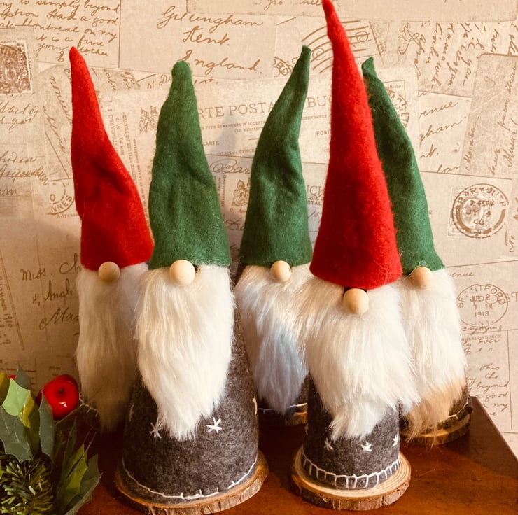 These little fellows are made from felt and have furry beards. They are all handmade and have tiny embroidered snowflakes around the bottom. They stand on a wooden base. The hats are wired so you can add character by bending them to different angles. Please give them a new gnome for Christmas!