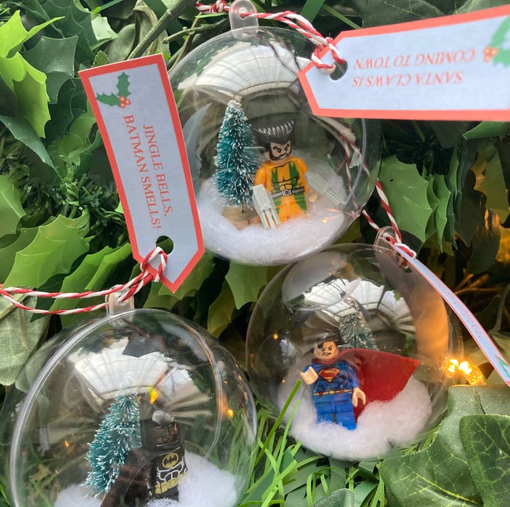 Mini-figures repurposed as Christmas baubles with snow and a Christmas tree. Comes with a puntastic paper tag! Set of 3 £10 or individual baubles available for £4 plus P&P.