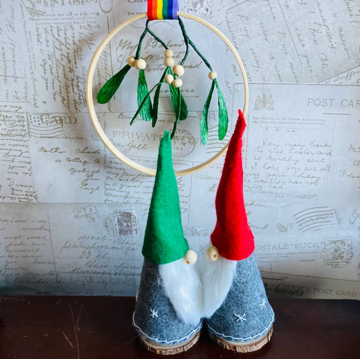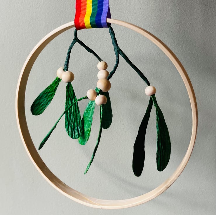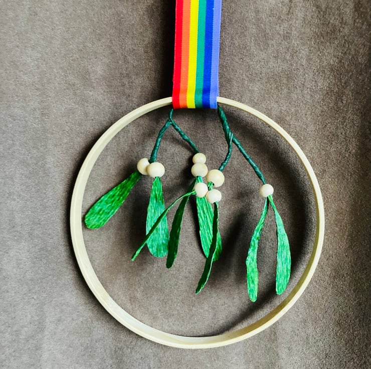 Handmade from crepe paper, wire, and wooden beads, a sprig of mistletoe hangs in a 15cm bamboo ring, finished with a rainbow ribbon, or a red and white heart ribbon. Time to get cosy!