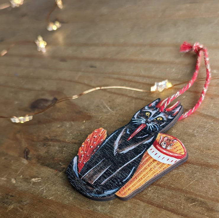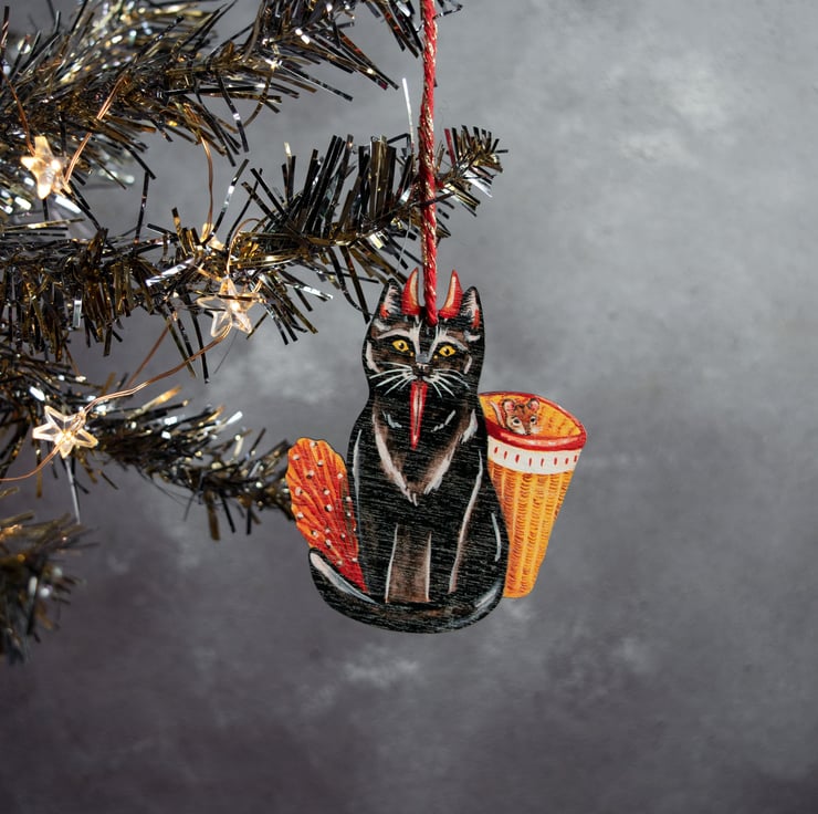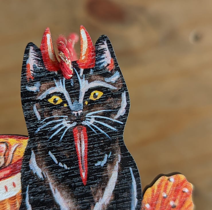 This Krampus cat design/ illustration is my own creation. It was originally a gouache painting of mine which I then meticulously converted into a decoration- so you won't find another one like it anywhere else!
