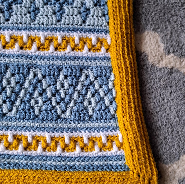 This is a lovely mosaic crochet blanket in geometric patterns in soothing shades of blue with a pop of mustard for the envelope border to frame them. Made in 100% super-soft double knit acrylic yarn, particularly cosy for those with sensitive skin.