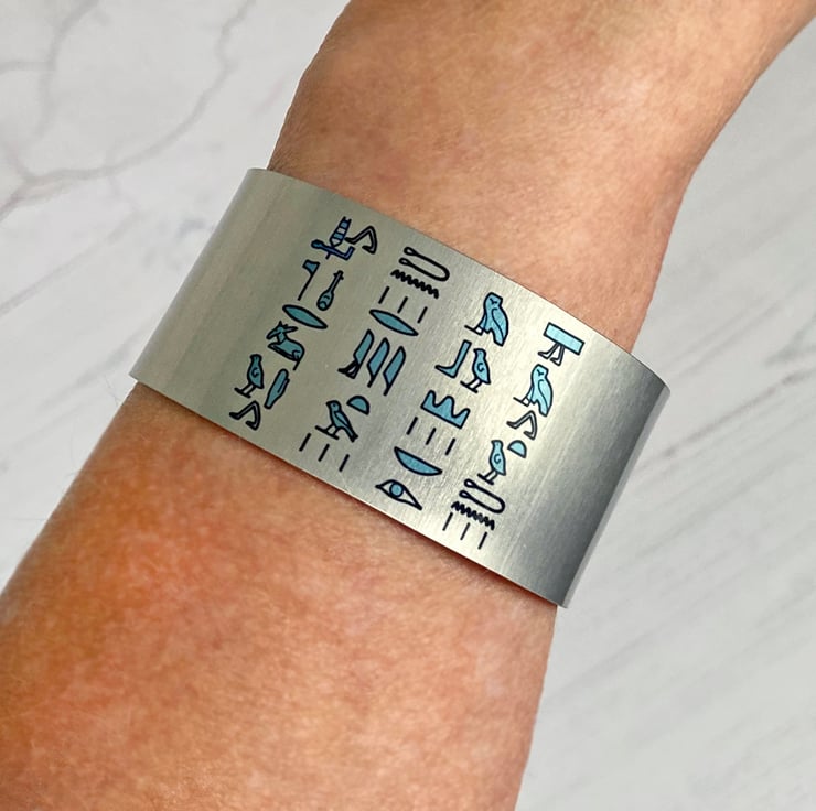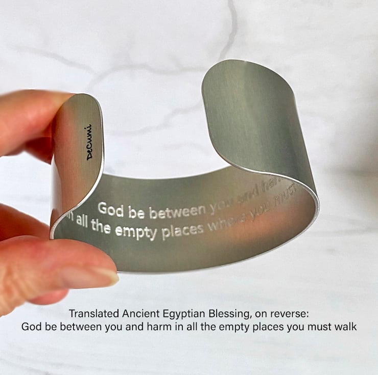 This is a handmade cuff bracelet with Hieroglyphics which translates to an ancient Egyptian blessing "God be between you and harm, in all the empty places you must walk"