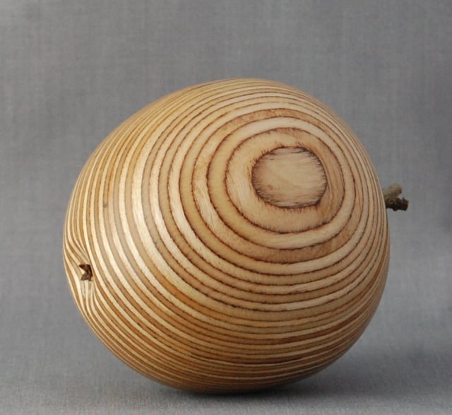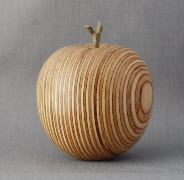 Our contemporary take on a wooden apple-hand turned from sustainable sourced birch plywood, this attractive apple will suit modern interiors. Ideal for the collector of wooden fruit, it is finished with a home-harvested silver birch stem and a clove to represent the blossom end. It is approximately 8 cm in diameter and 8.5 tall without the stalk.