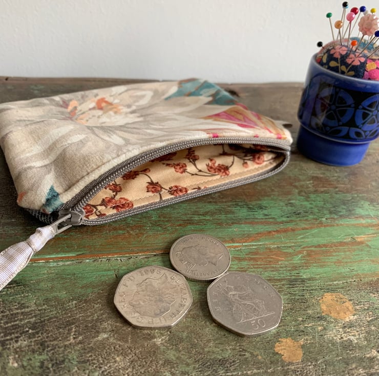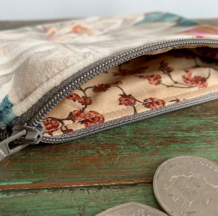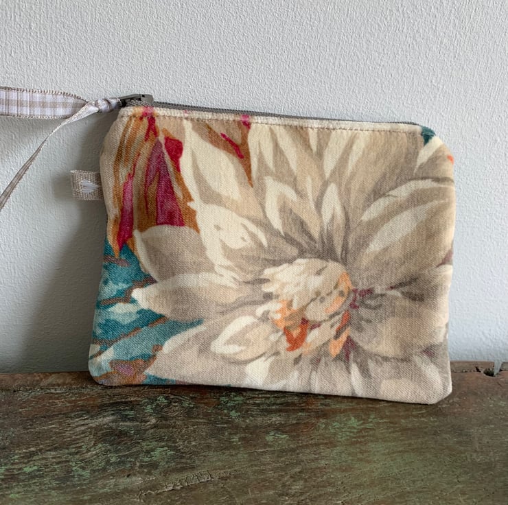 Cute little coin purse made from Sanderson Dahlia and Rosehip velvet backed with soft fabric from a sample swatch. It is lined with pretty floral cotton.