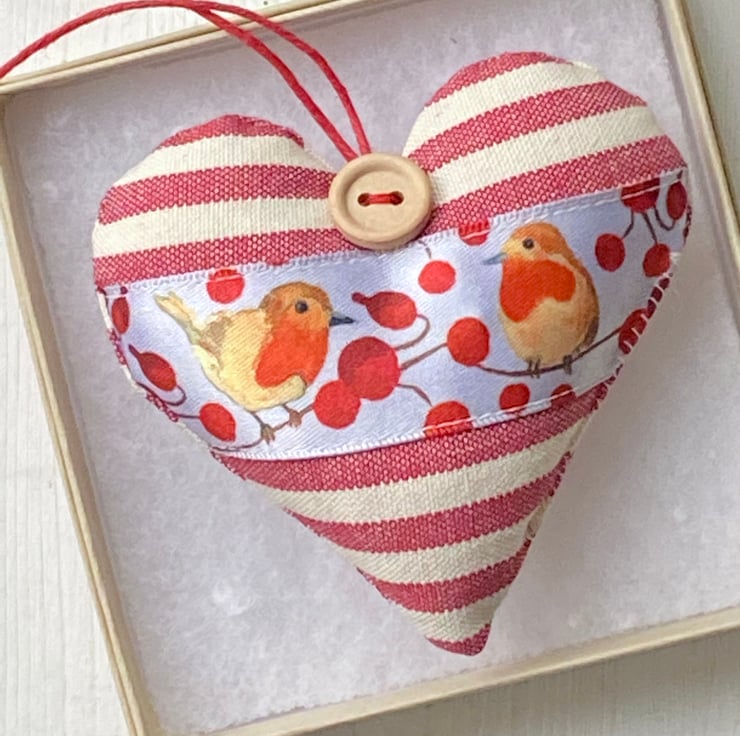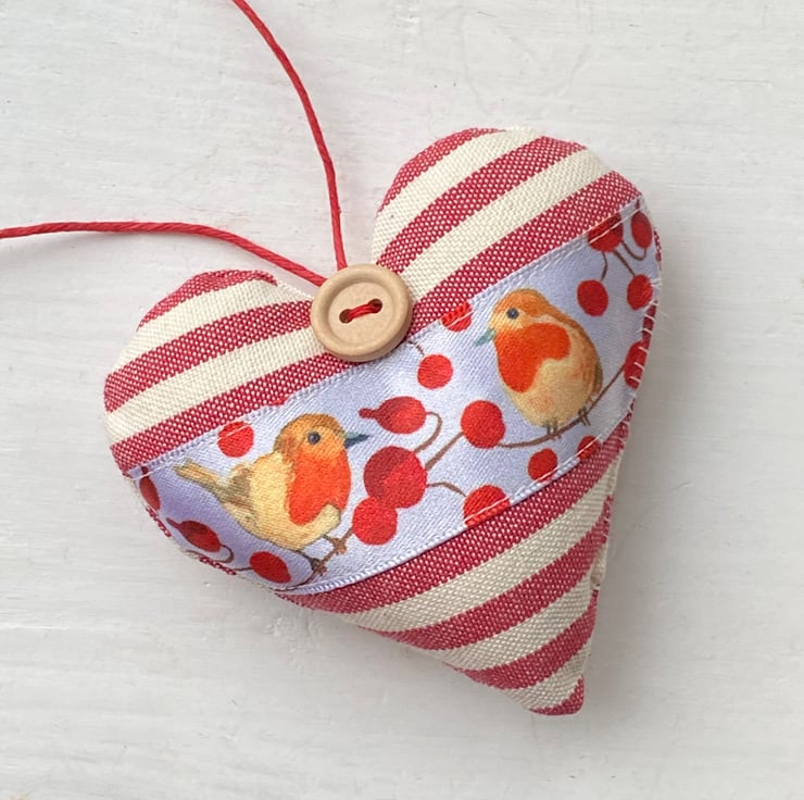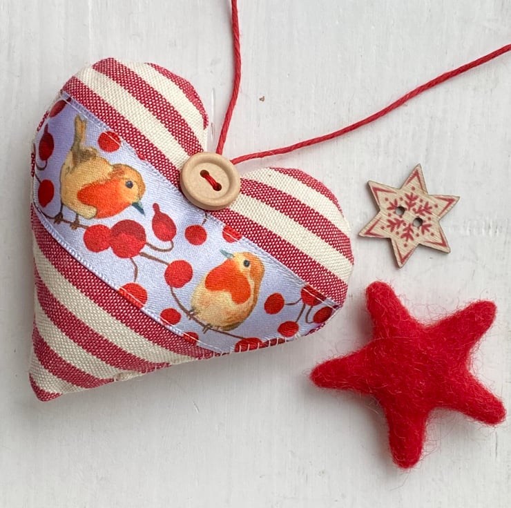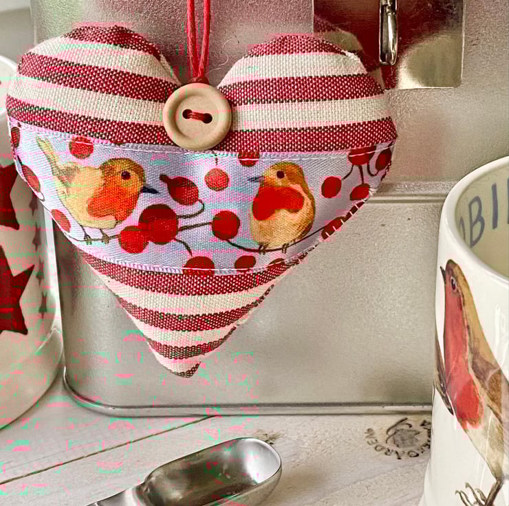This year it takes the very appealing form of a striped heart - here in red and white (and also available in charcoal grey stripes - see separate product listing). Featuring a pair of chirpy, cheeky robins feasting on red berries on the wide satin ribbon, padded with toy stuffing plus whole cloves for a warm and spicy Christmas aroma. And hand-finished with a round rustic wooden button plus red natural hemp twine hanging ties.