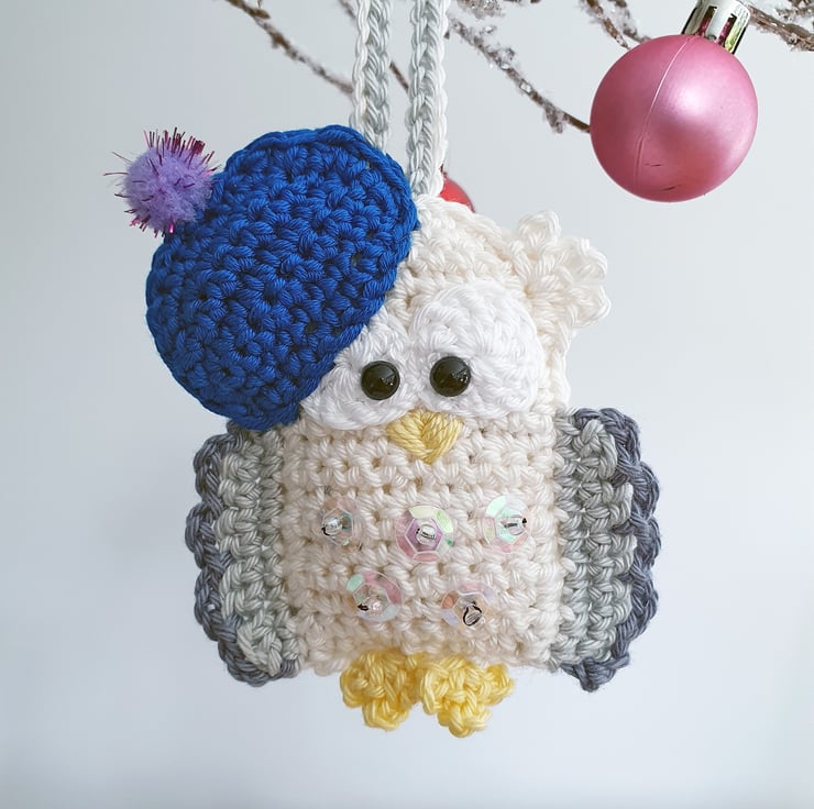 Crocheted in cotton yarn, this cream owl measures approx 10cm in height (including hat) and 17cm including the hanger. He is decorated with iridescent sequins, and has a sparkly pom pom on his hat!