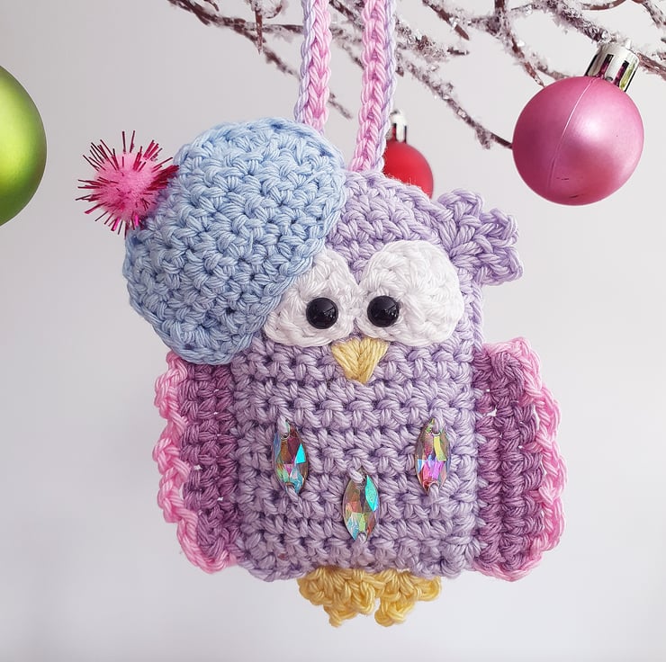 Crocheted in cotton yarn, this purple owl measures approx 10cm in height (including hat) and 17cm including the hanger. She is adorned with crystals, and has a sparkly pom pom on her hat!