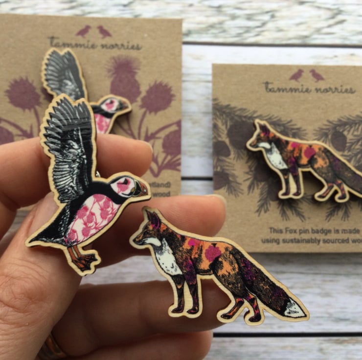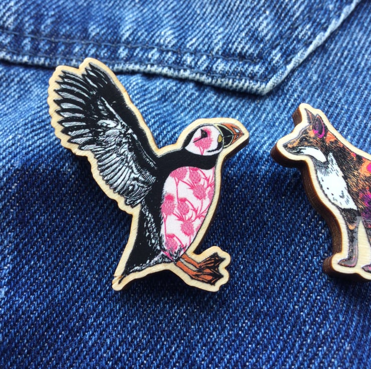 Wooden Puffin and Fox pin badge.