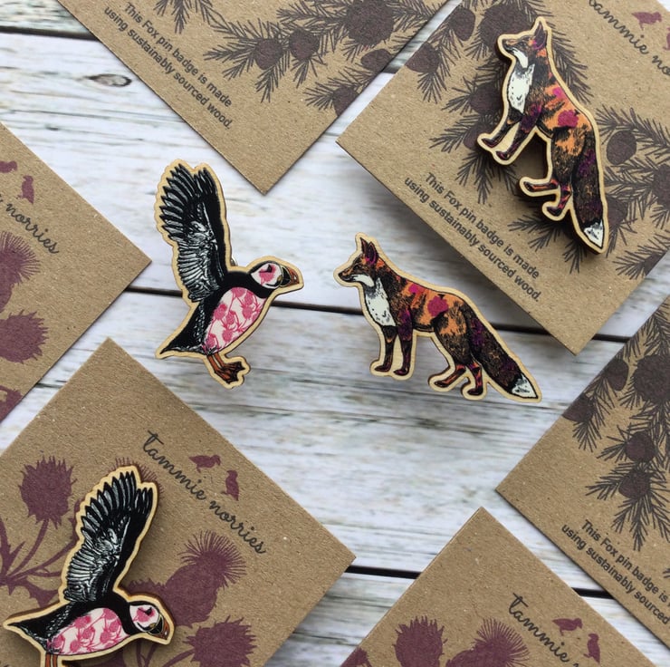 These Puffin and Fox wooden pin badges are made from sustainable wood which is a great eco alternative to enamel pins.