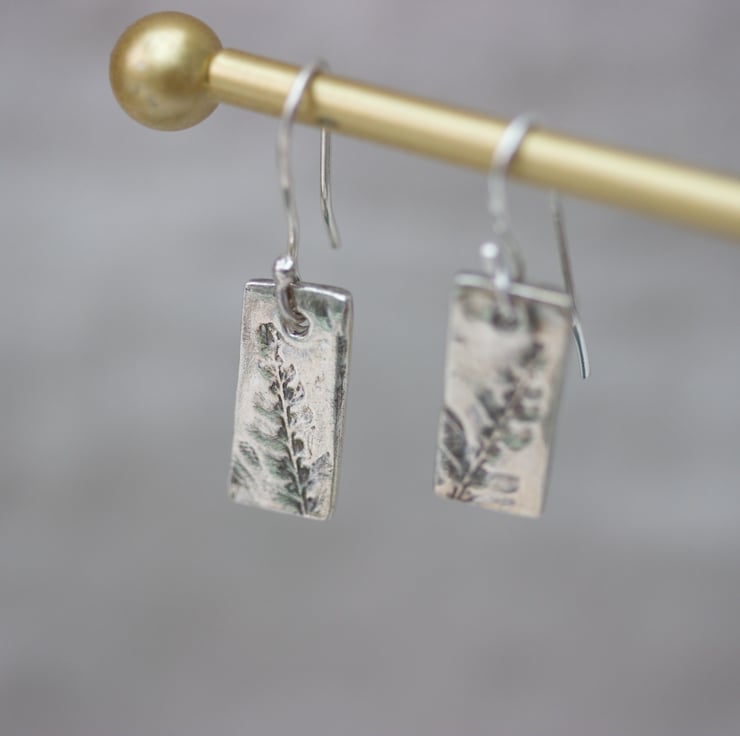 These super shiny earrings feature a fern pattern. Due to the highly polished finish, the fern pattern is more blurry than my usual fern leaf earrings. You can still see it's a fern leaf, but is more subtle.