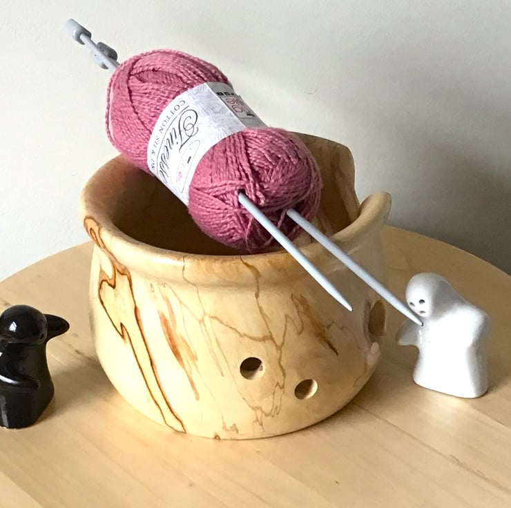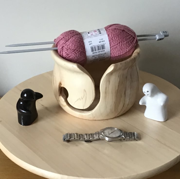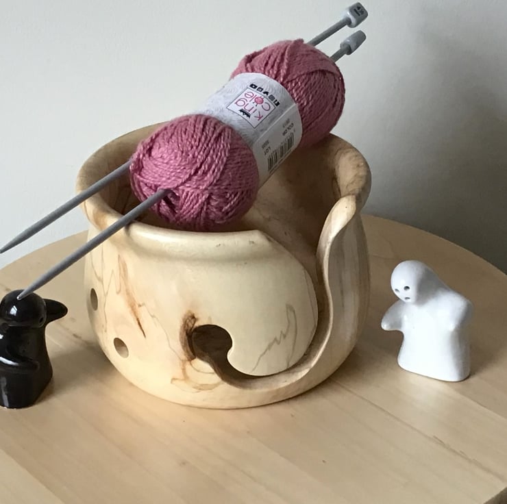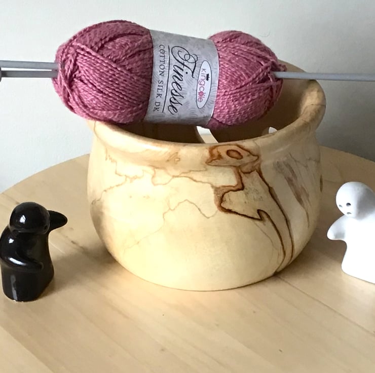 Small yarn bowl handmade from a locally sourced Sycamore tree with amazing grain and spalted appearance. The light colour of the timber together with the unusual irregular black/brown markings make this a nice piece.
