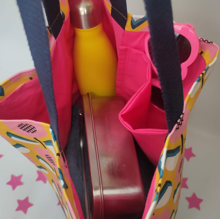 The tote bag can be carried over the shoulder and is 44cm tall by 40cm wide.