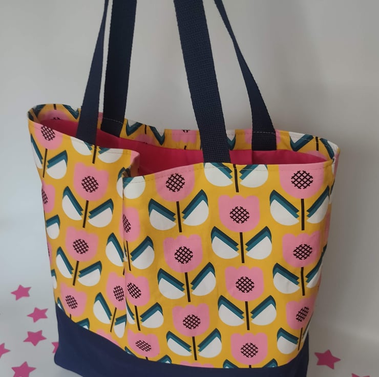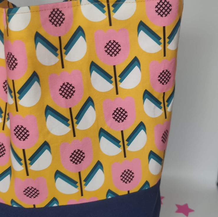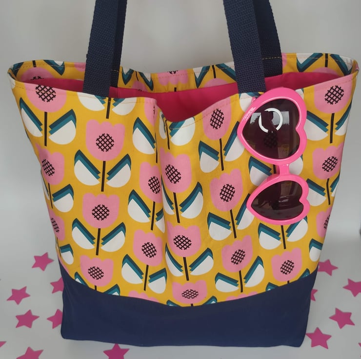 Navy blue cotton canvas is paired with this amazing Figo Fabric flower power cotton. Just peek inside at the pop of hot pink lining and good sized pocket for even more fun :)