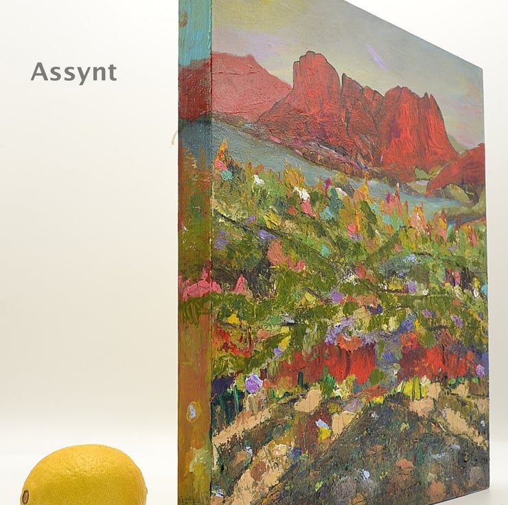 (061) This is a contemporary artwork of Assynt - an area of beautiful and inspiring land in the south-west of Sutherland, Scotland. The mountains are so distinct and inviting, it is well worth a visit at any time of the year.