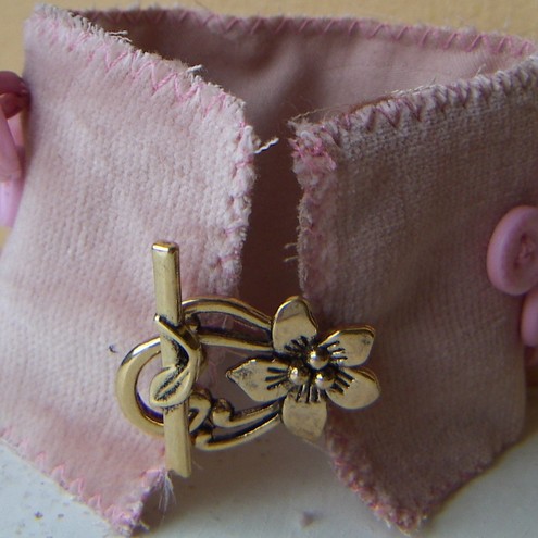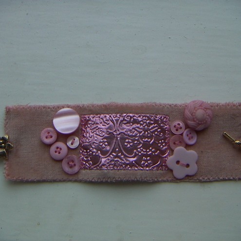 Wristlet made from pale pink velvet, with embossed and stitched pink aluminium damask embellishment, vintage buttons and brass tone fastening. Raw stitched edge and lined with pink cotton damask.