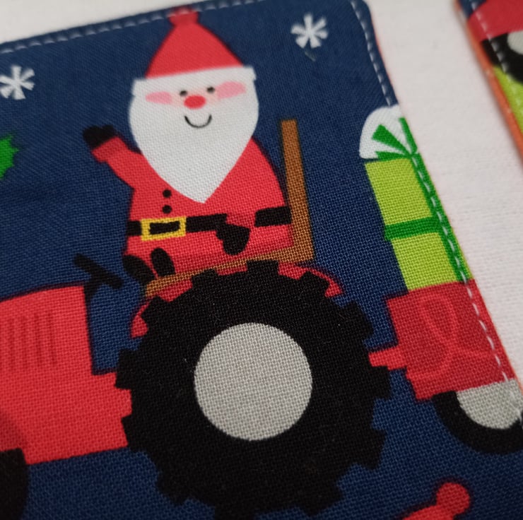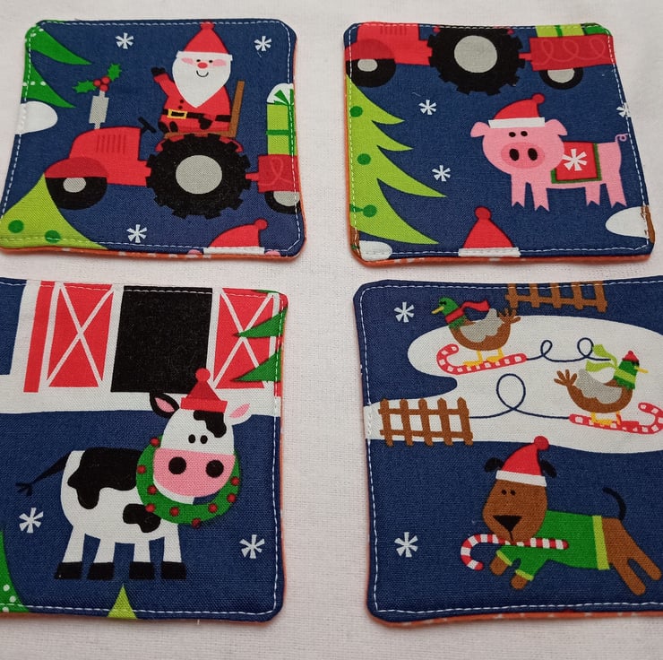 Fun fabric coasters with Christmas farm theme. Sold in a set of 2 which feature Santa and Pig, or a set of 4 that also includes Cow and Dog. All wearing festive Santa hats. Backed with a beautiful pop of bright orange.