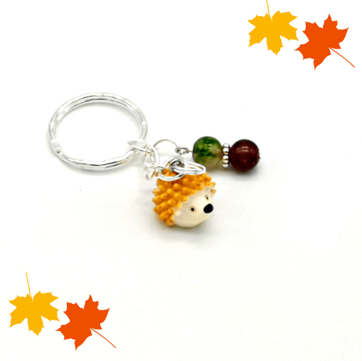 A cute keyring featuring a 3D chunky hedgehog and glass marbled beads.