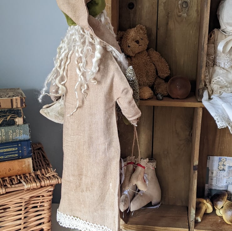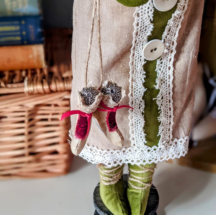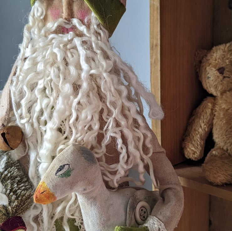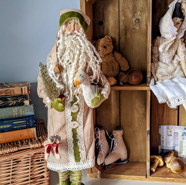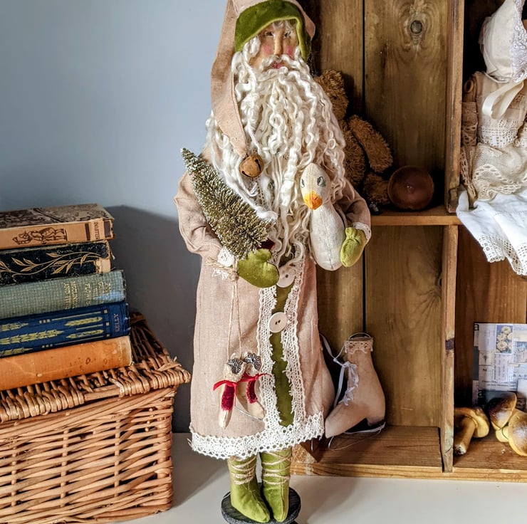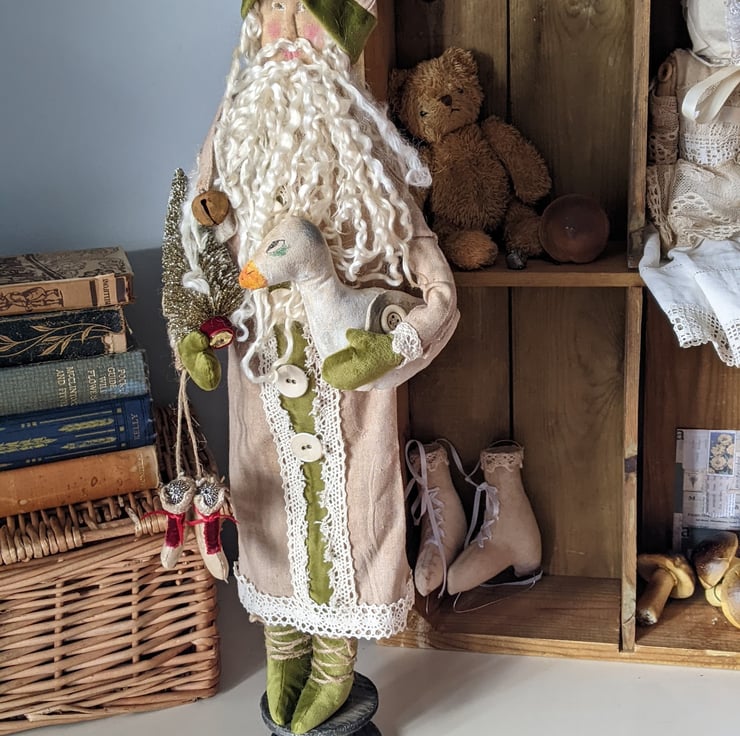 This charming fellow is hand and machine stitched in un bleached calico, he has a needle sculptured and hand painted face. His dyed calico coat is trimmed in the front in a moss green vintage velvet and stained cream lace. Sitting down the front of his coat are four 1930s shirt buttons found in a flea market perfect for just this occasion. He carries in his arms a golden Christmas tree and a tiny pair of ice skates with red velvet ribbon trim (a gift for a lucky child), and a goose (because why not) with a Victorian bone button on it's wing.