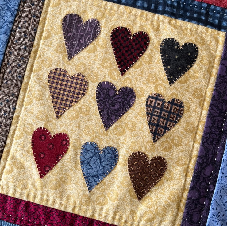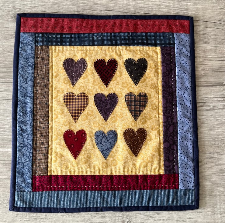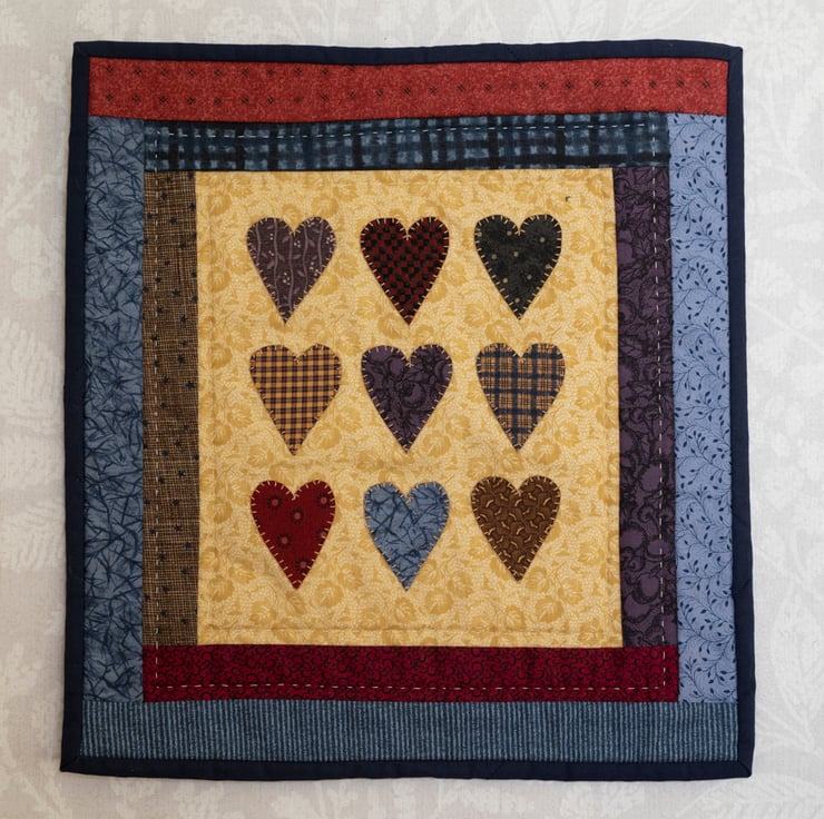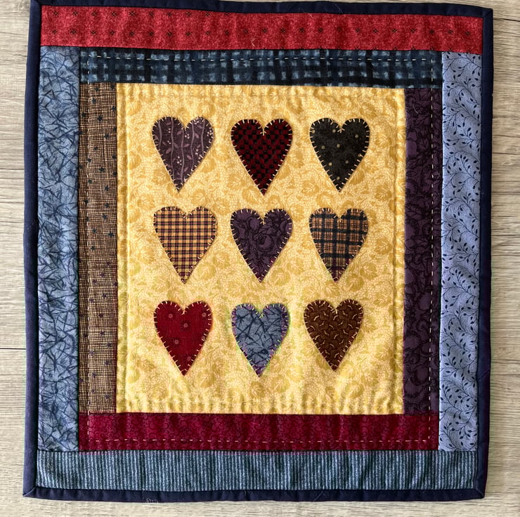 This country style wallhanging features nine hearts appliquéd to a background using blanket stitch. The hearts are each made from a different printed fabric.