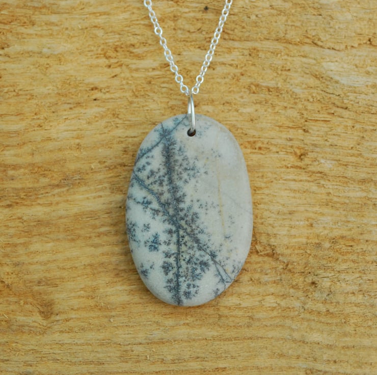 We love to beachcomb, and take the chance when we're on holiday to find unusual pebbles. This amazing example is from Cyprus, and is perfectly shaped. The pattern reminds us of fossil plants. We have polished the pebble so it has an attractive sheen, and mounted it using sterling silver.