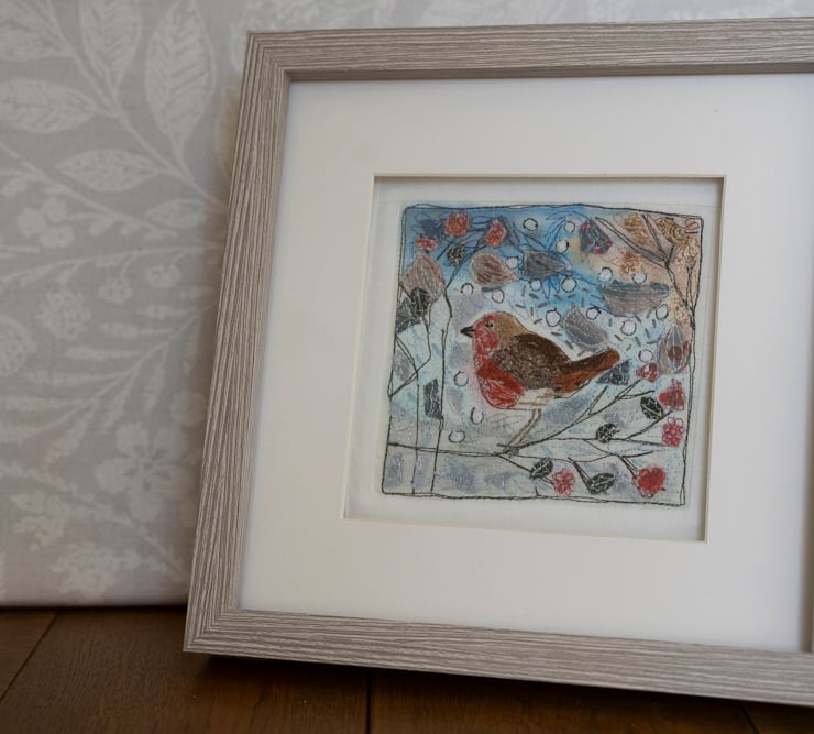 The substantial box frame measures approximately 26cm square and perfectly shows off the robin embroidery which is 12cm square. It can be hung or be free standing.