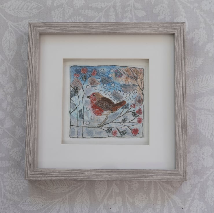 This one of a kind embroidery features a charming robin against a backdrop of leaves, branches and autumn berries. I feel it suggests the change of seasons from autumn to winter.