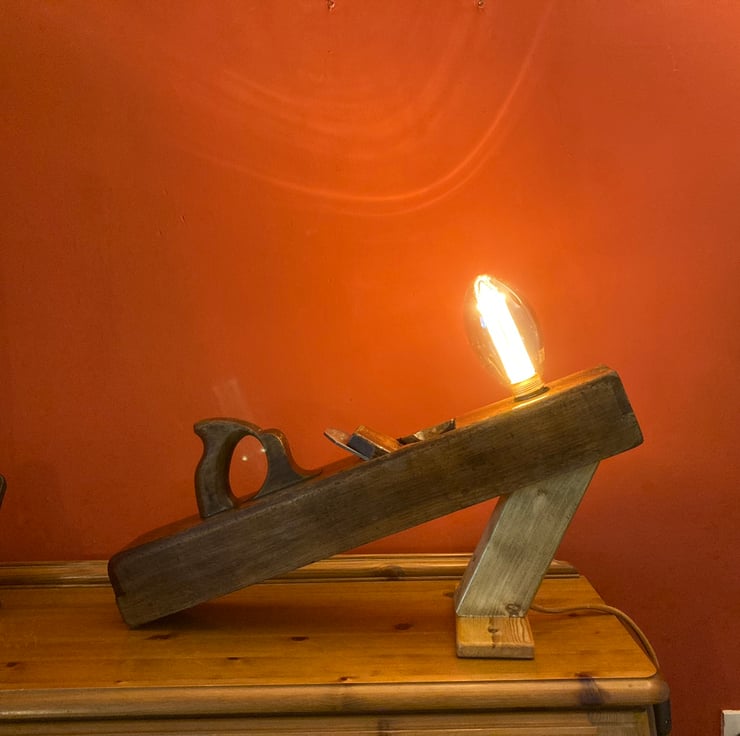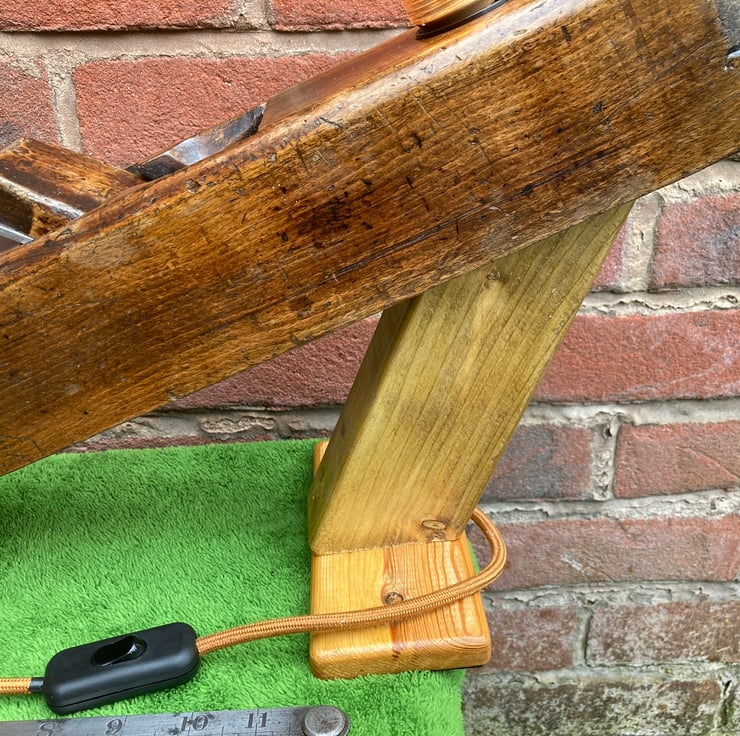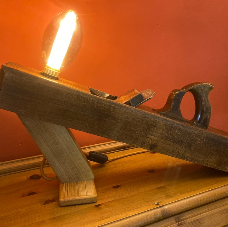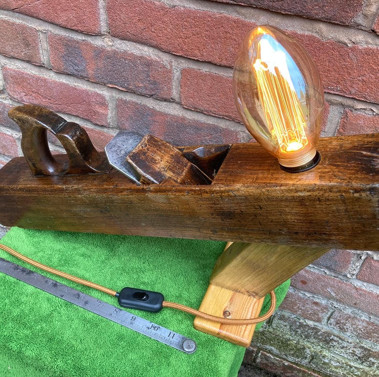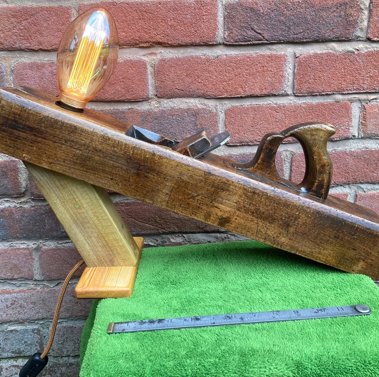 I have lightly sanded the beech wood and given it a few coats of French polish, which has added shine and brought out the beauty of the wood and patina, mounted an Edison Screw (E27) lampholder into the toe end and made an angled stand which holds the plane at an interesting slant. The stand is made from reclaimed timber and has also been French polished.