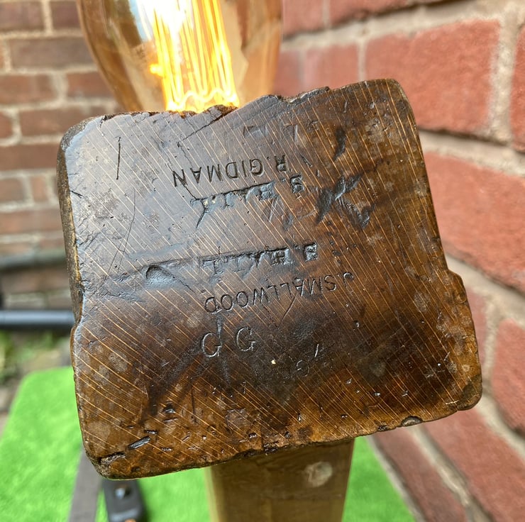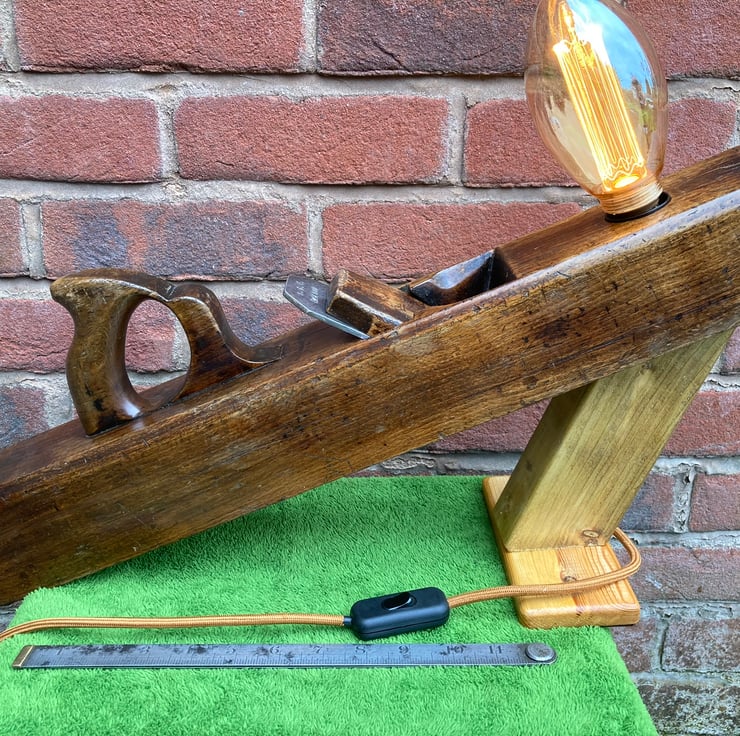 An imposing wooden table lamp made from a late Victorian 22-inch jointer plane. It has the names GG, R Goodman, J Smallwood and S Hall, proud previous owners, stamped neatly into both ends. Inevitably for a craftsman’s tool, it has knocks about the body and chips from the top of the handle and top of the toe end. The original blade was missing, so I have made and fitted a dummy blade without an edge.