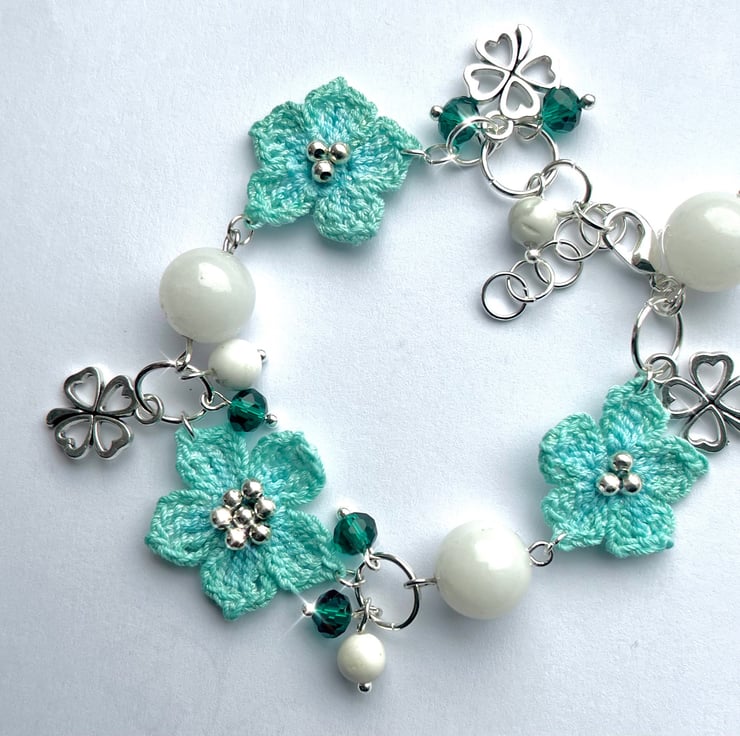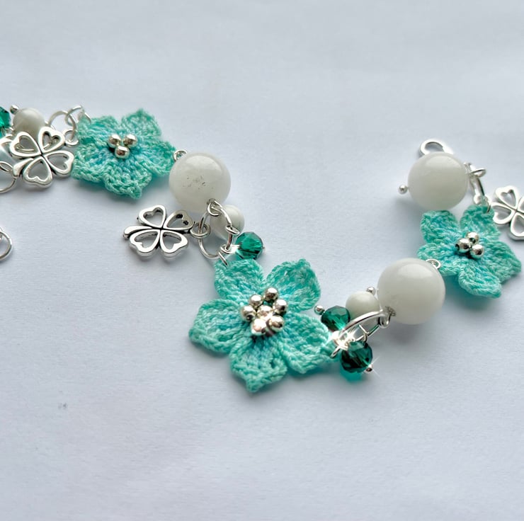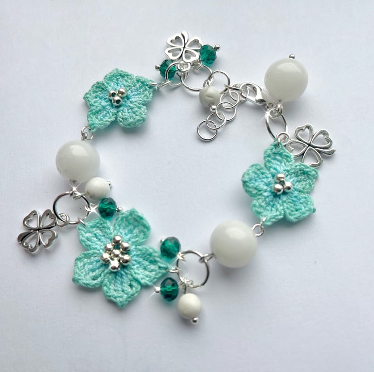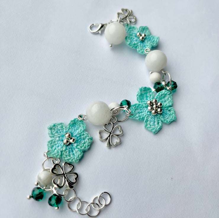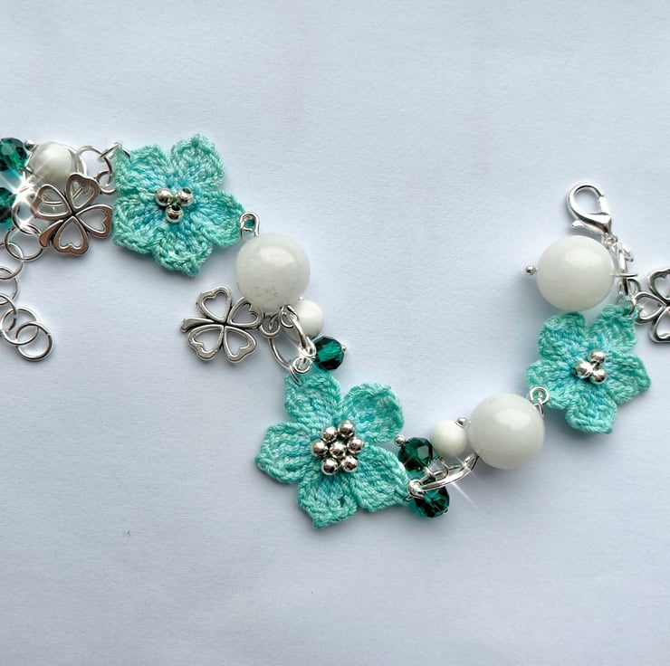 Microcrochet Florals , White Agate, White Howlite, Green Glass Beads Bracelet