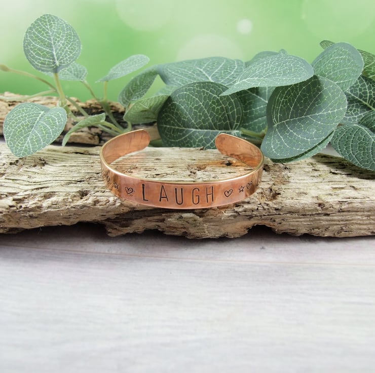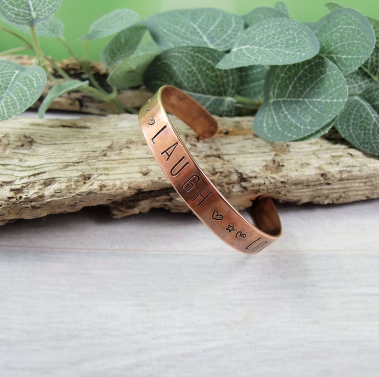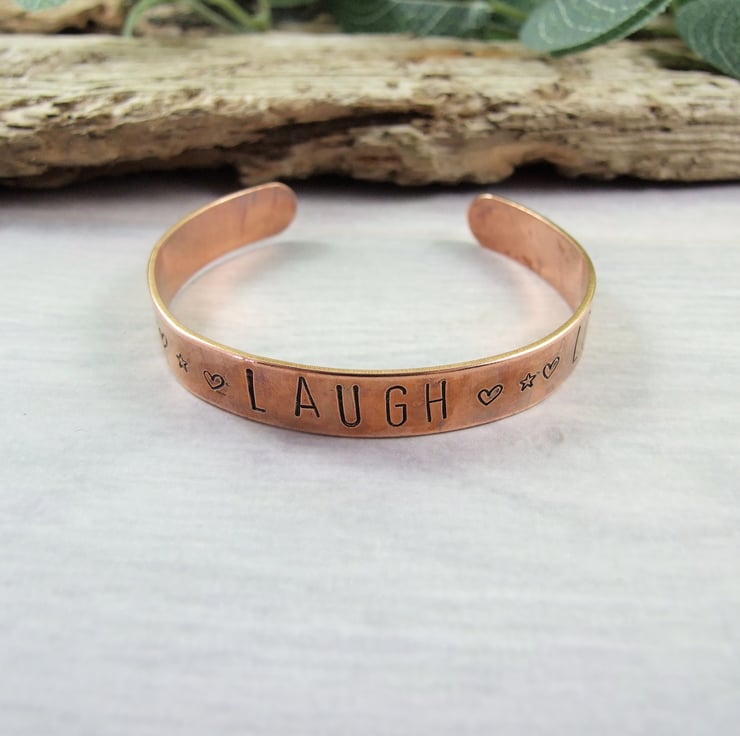 I have made the bangle from 1.3mm thick solid pure copper shaped and forged by hand hand stamped the words Live, Laugh and Love with little hearts and stars in between using steel stamps to create the cuff. Polished finish.