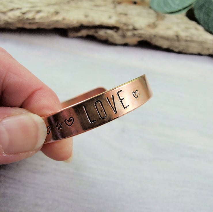 Copper Cuff Bangle stamped Live, Laugh, Love with hearts and stars. Medium fit to suit 6-7 inch wrist.
