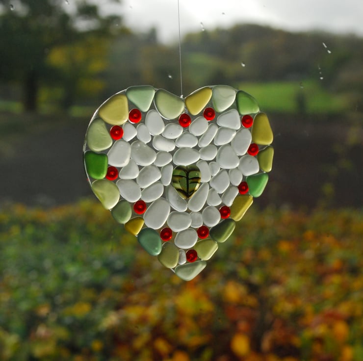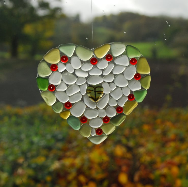 Beach glass comes in subtle colours, especially the olive glass typical of old bottles. This gorgeous sun catcher uses these olive shades to great effect by using a beautiful heart and bright red glass beads. The three-dimensional nature of tumbled beach glass means the mosaic picks up the light in a special way, even on a dull rainy day!