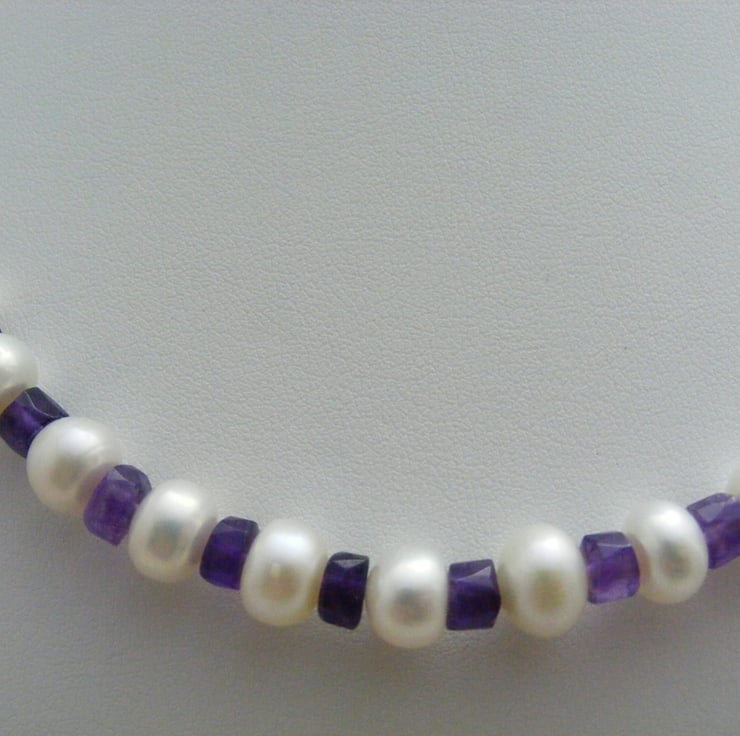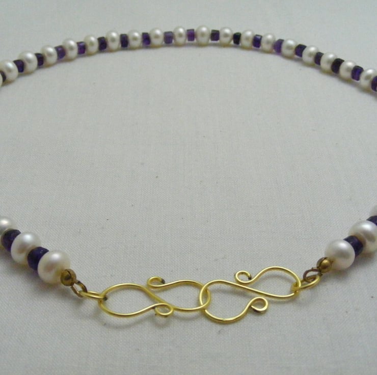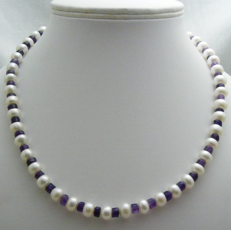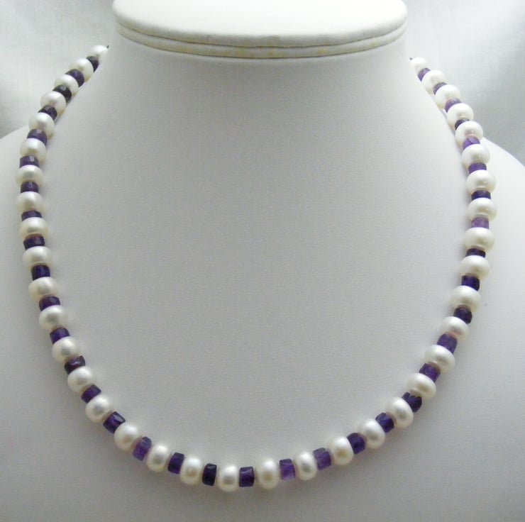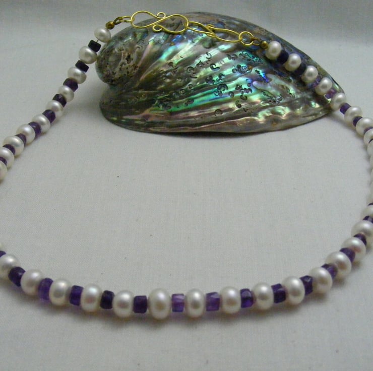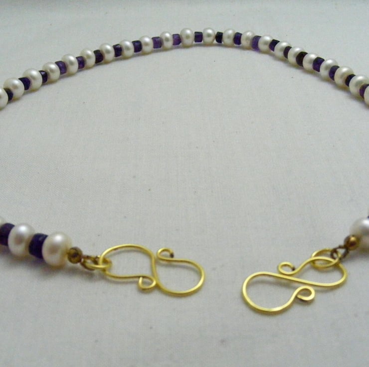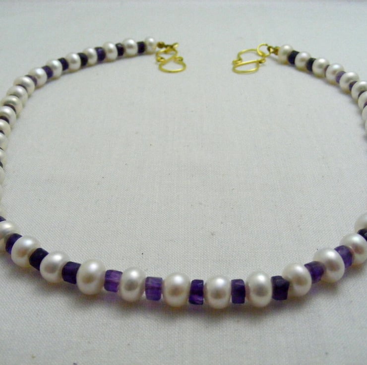 One of a kind gemstone necklace handmade with, 7x5mm white freshwater rondelle pearls, graduated amethyst gemstone rondelles, gold plated findings and a gold plated handmade clasp.