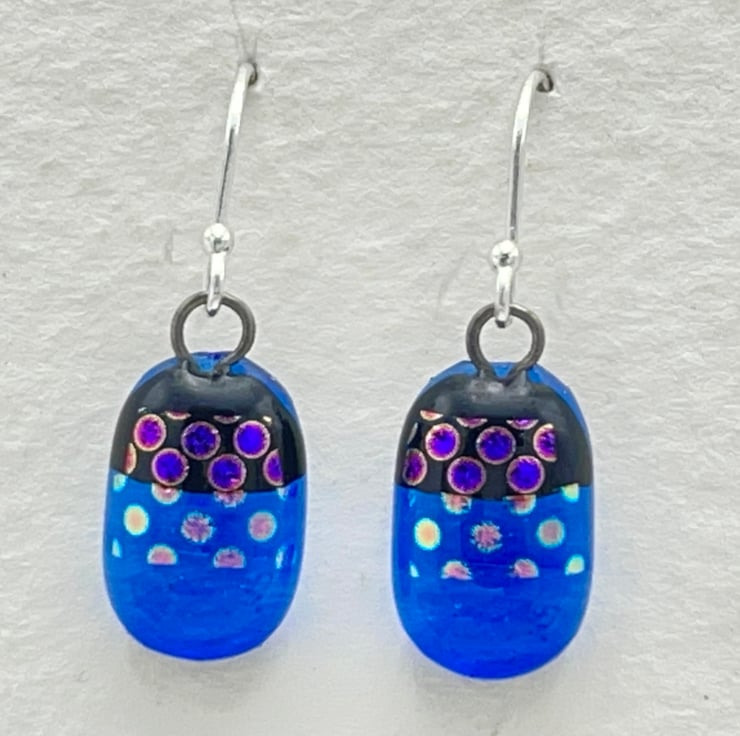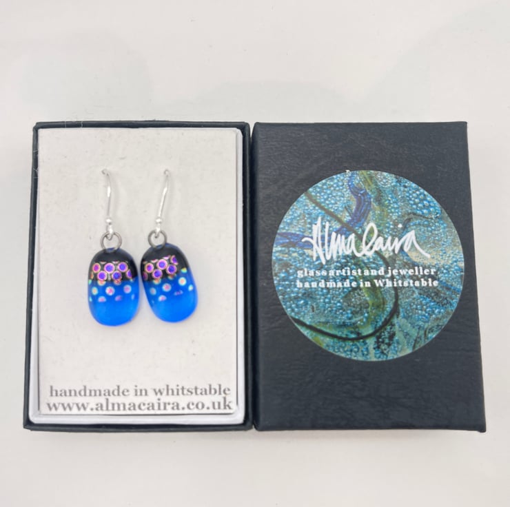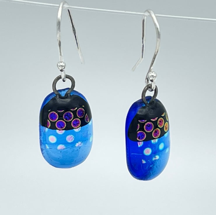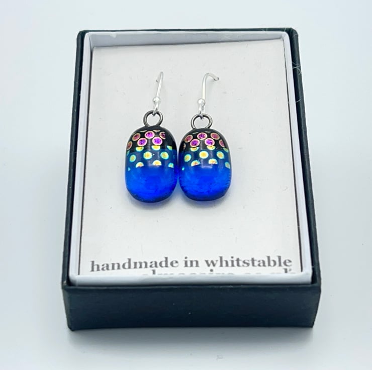 Created from layered Bullseye glass in my Whitstable workshop. Sterling silver ear wires. Made with transparent blue and dichroic glass.