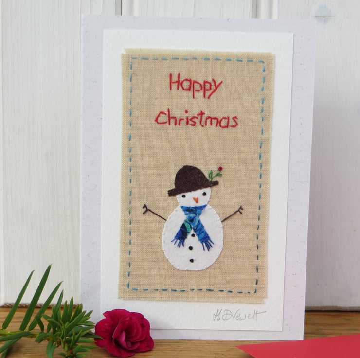 Hand stitched words with miniature applique snowman,with lots of embroidered details including a berry twig in his hat!