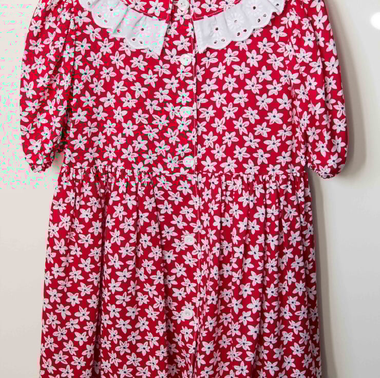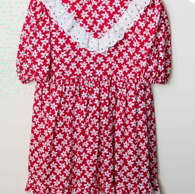 Red dress covered with pretty white daisies.
