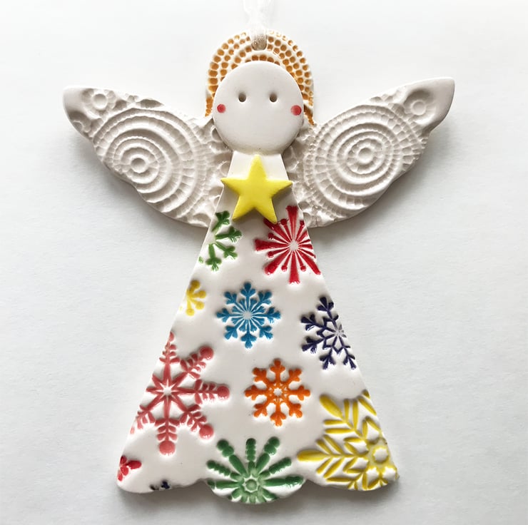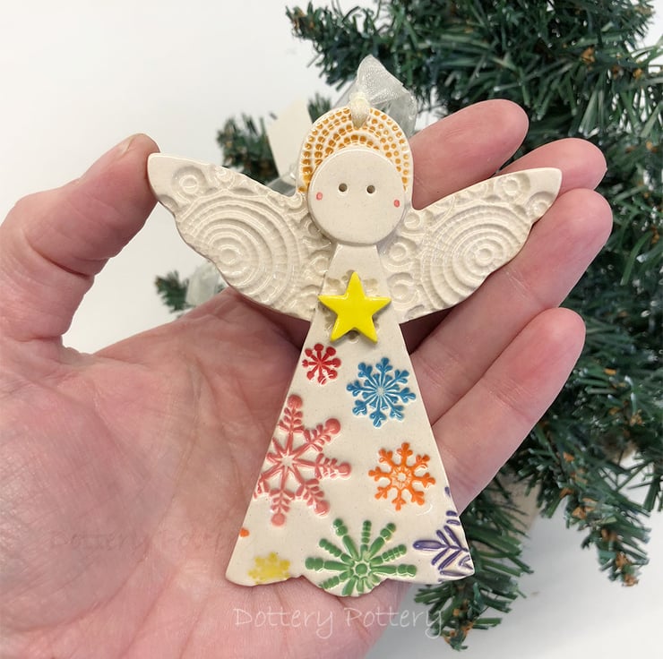 This cute little angel is made from white earthenware clay and decorated with coloured snowflakes. It has been finished with a clear, glossy glaze. Fired twice. Glazed on the front only. It measures 8.5 cm high and 7 cm wide and hangs from a cream organza ribbon. (snowflake pattern placement and multicolours will vary from angel to angel, so you may not get the exact angel photographed here but it will be just as lovely)
