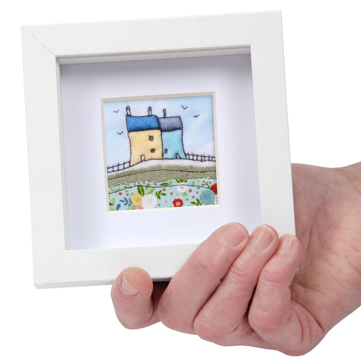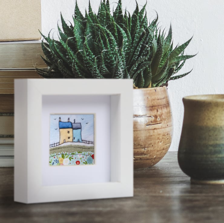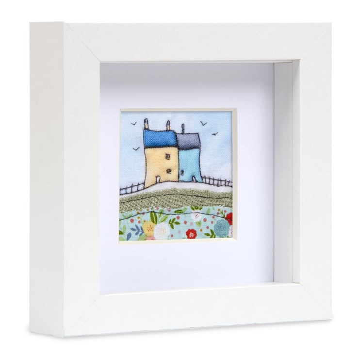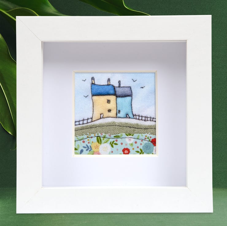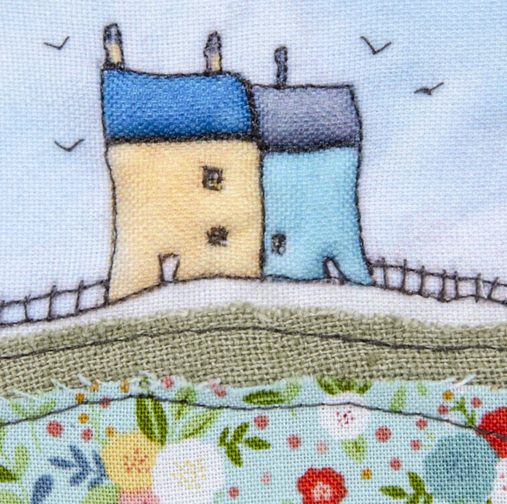 Little fabric houses - a hand embellished textile print, carefully stitched and slightly padded, to give it an unusual three-dimensional appearance.