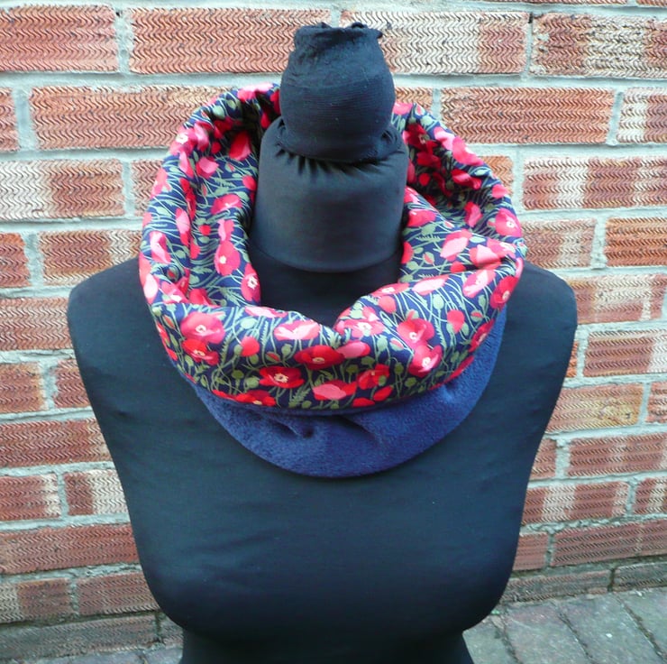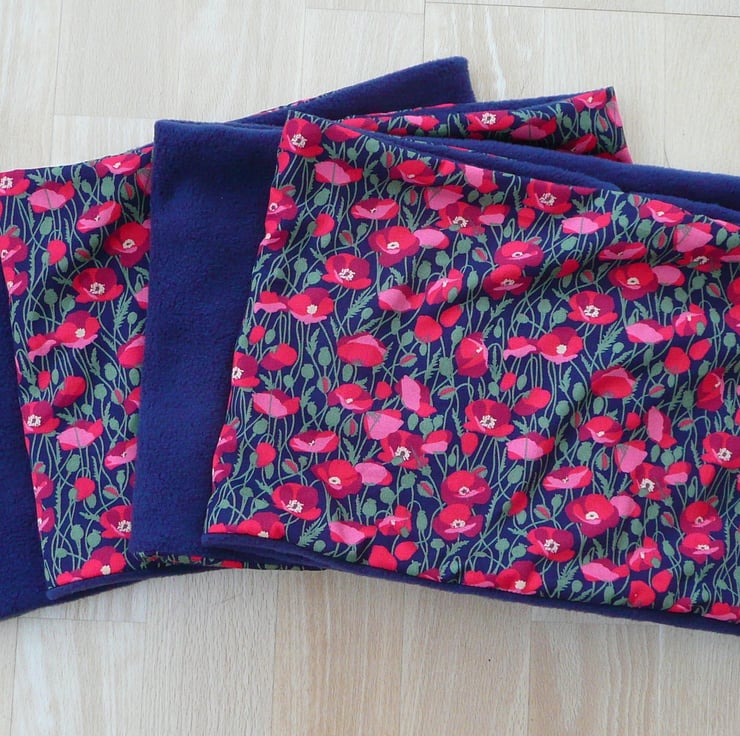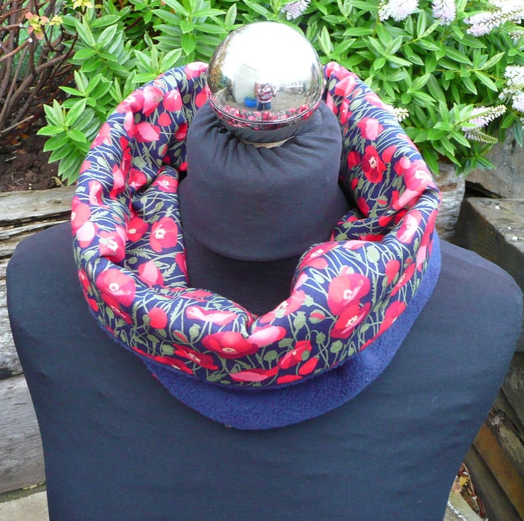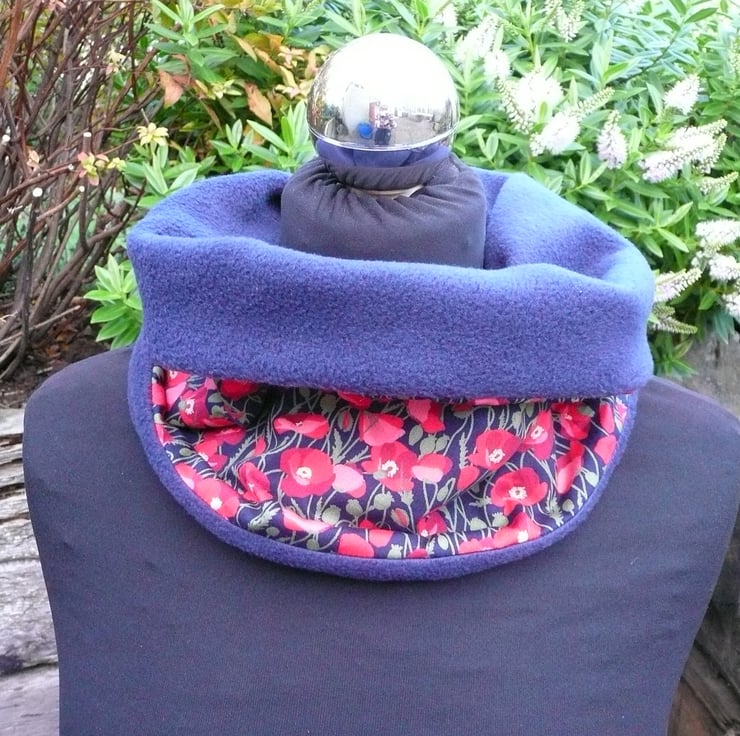 Not everyone likes a traditional scarf, so here we have a neck warmer, made from navy blue polyester fleece and 100% cotton print fabric. The can be worn either with the fleece on the inside or the outside.