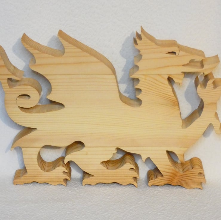 Pieces of recycled wood were first glued together, then cleaned and sanded to enable me to upcycle it. The design was applied to the wood and cut using a Scroll Saw. The Dragon was lightly sanded all around to give it a slight round over effect before 'Cymru' was completed in pyrography. It was then coated in Danish Oil, which is toy and food safe, to protect the ornament.