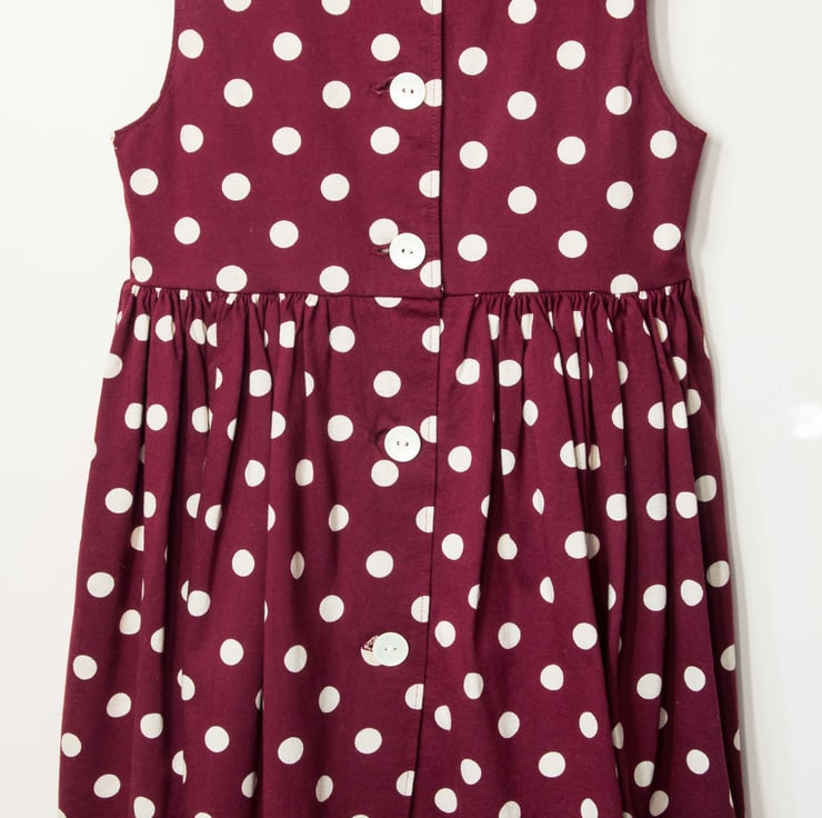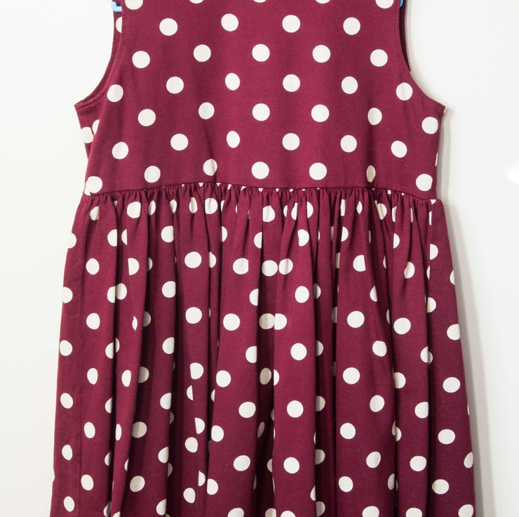 Burgundy cotton jersey, sleeveless dress with cream spots.