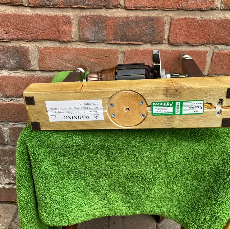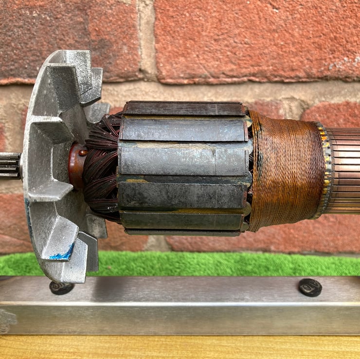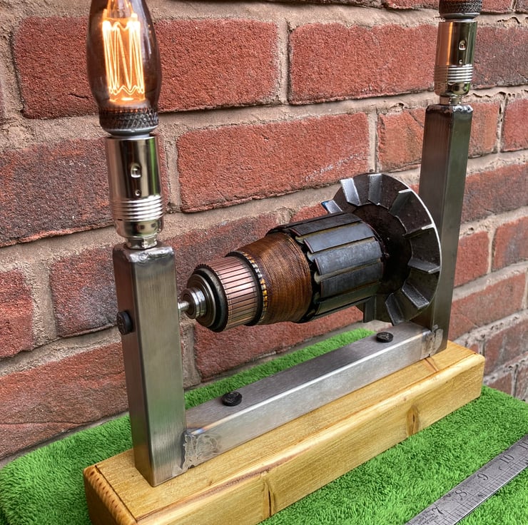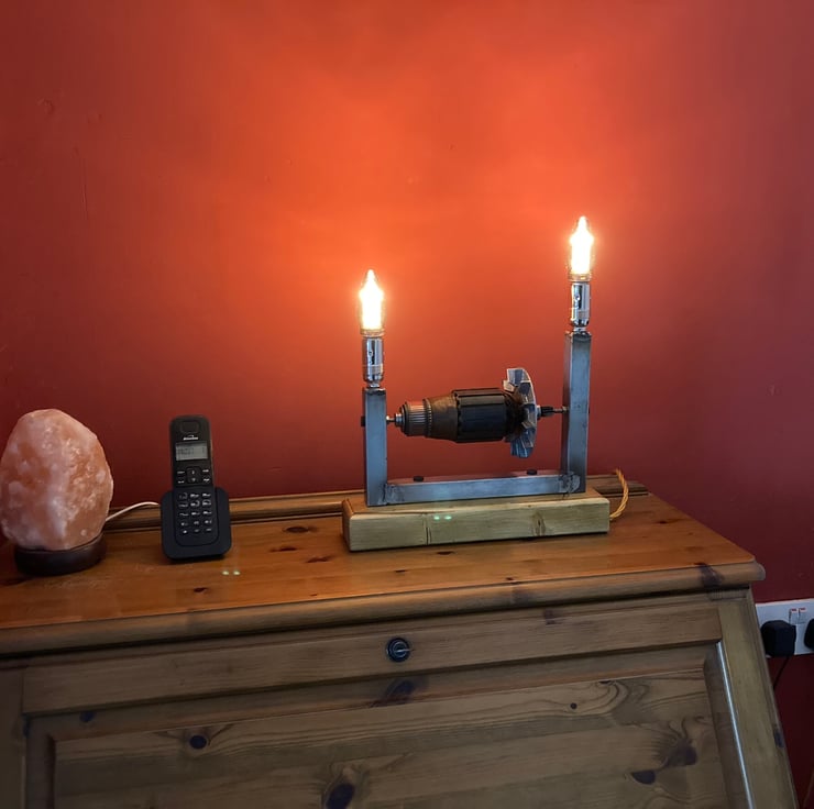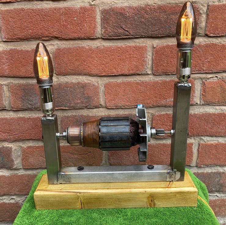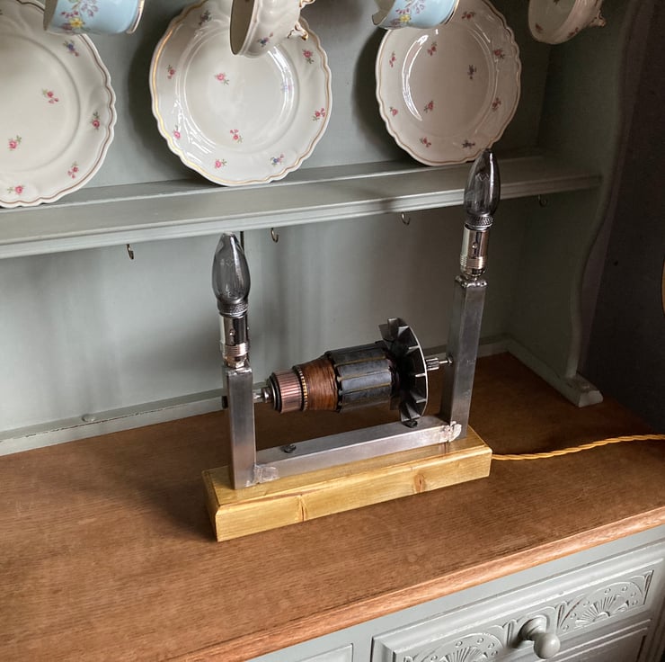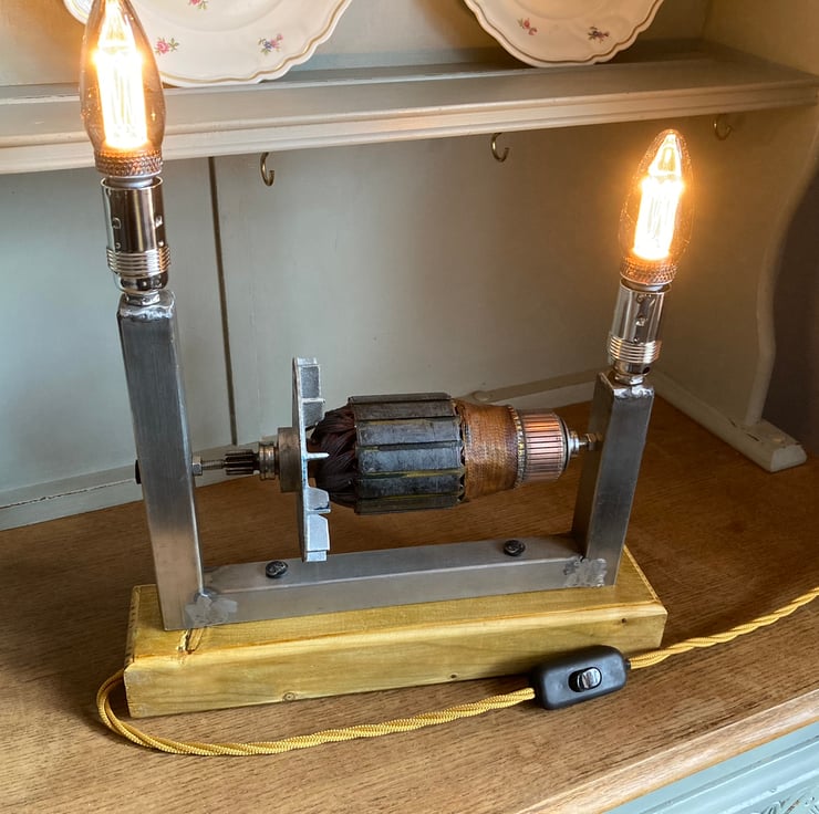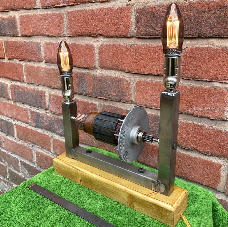 A lamp with a museum piece look, with the armature from a 1960s Wolf heavy duty electric drill as the centrepiece. I have welded an asymmetrical frame to support the armature (between centres so it can be manually spun) from stainless steel 25mm box section. At the top of each of the uprights I have fitted a nickel-plated SES lampholder, each of which carries a 2-Watt smoked squirrel cage LED candle bulb.