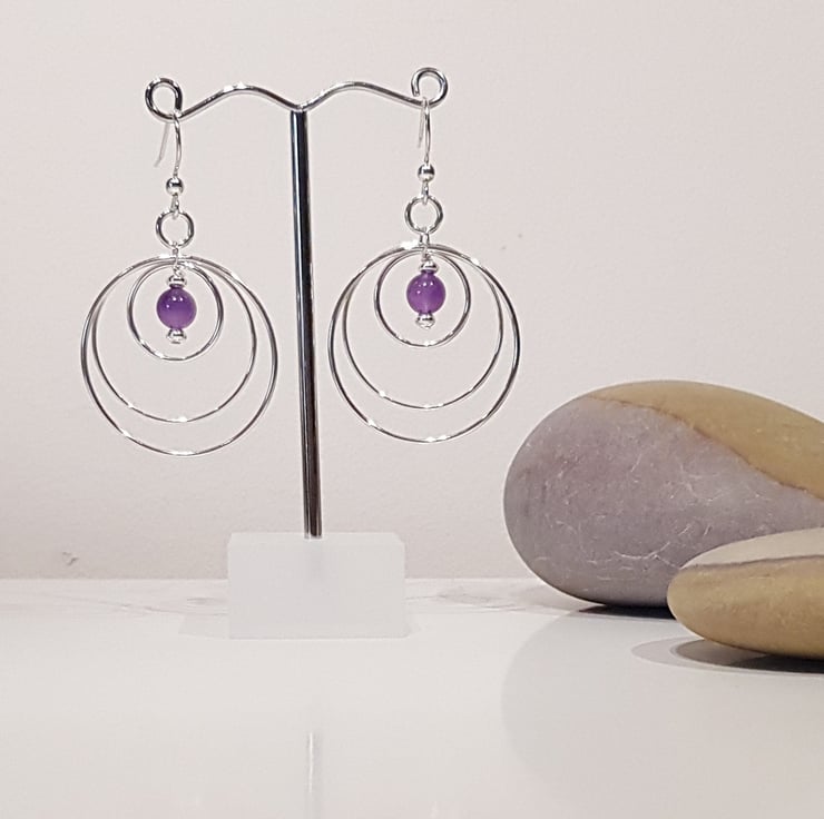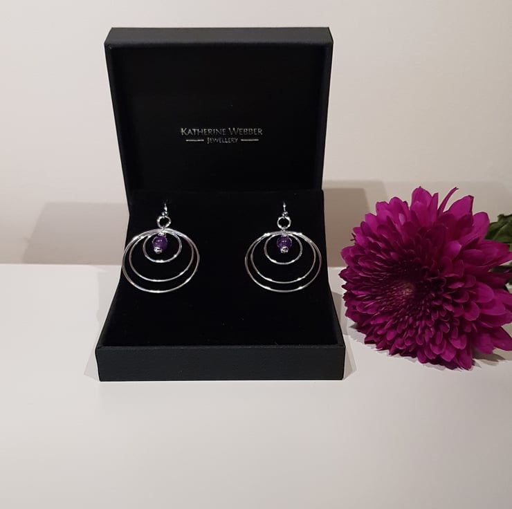 These amethyst earrings may be delicate but they still make a statement. The pretty amethyst semi-precious beads are beautifully framed by three sterling silver hoops. The sterling silver hoops are held together by another sterling silver rings. This allows the hoops and amethyst gemstone bead to move gently when worn allowing the silver and amethyst to catch the light, creating a three-dimensional impression.