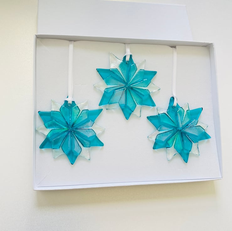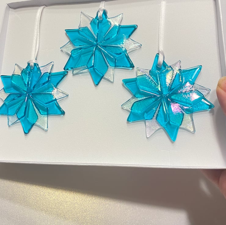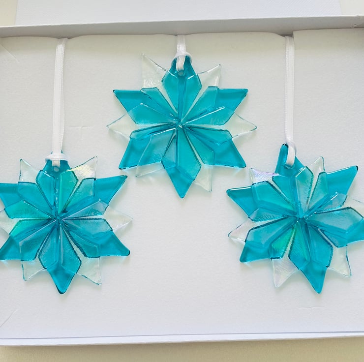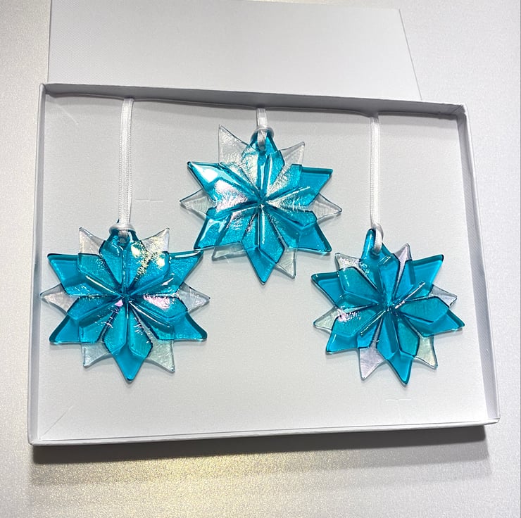 Just gorgeous - a trio of fused glass snowflakes created using iridescent and turquoise glass . Each Beautiful decoration is approximately 2.5 inches . Each is drilled and strung with white ribbon. The trio comes in a white gift box . Perfect gift for Christmas