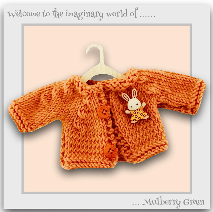 A really pretty apricot cardigan, with a twisted knit body, to fit the Mulberry Green characters. The cardigan is handknitted and is finished with a cute bunny decoration and little apricot buttons.