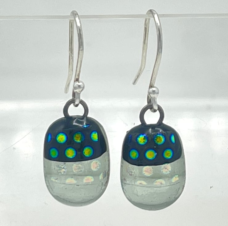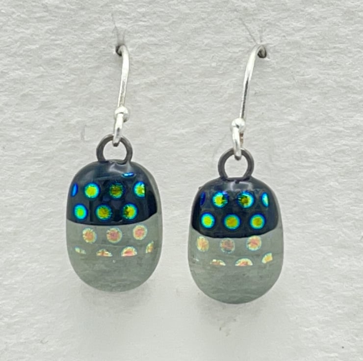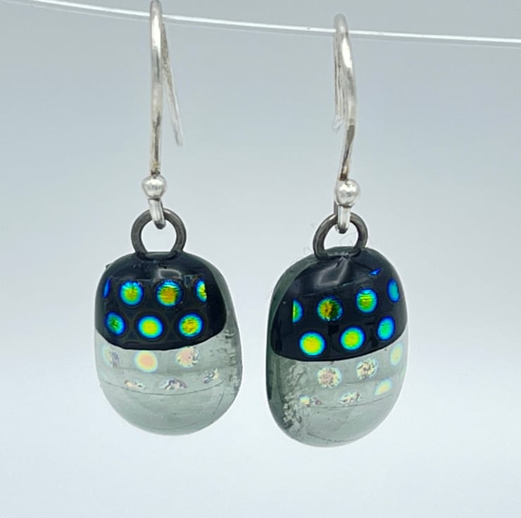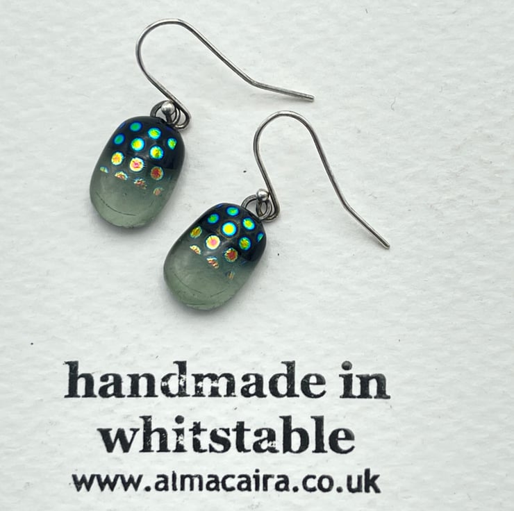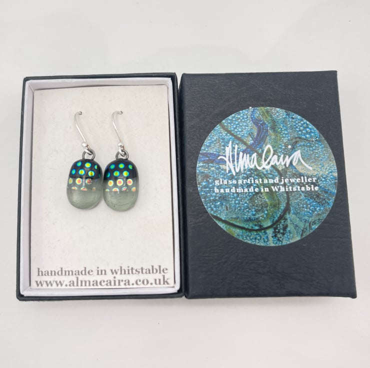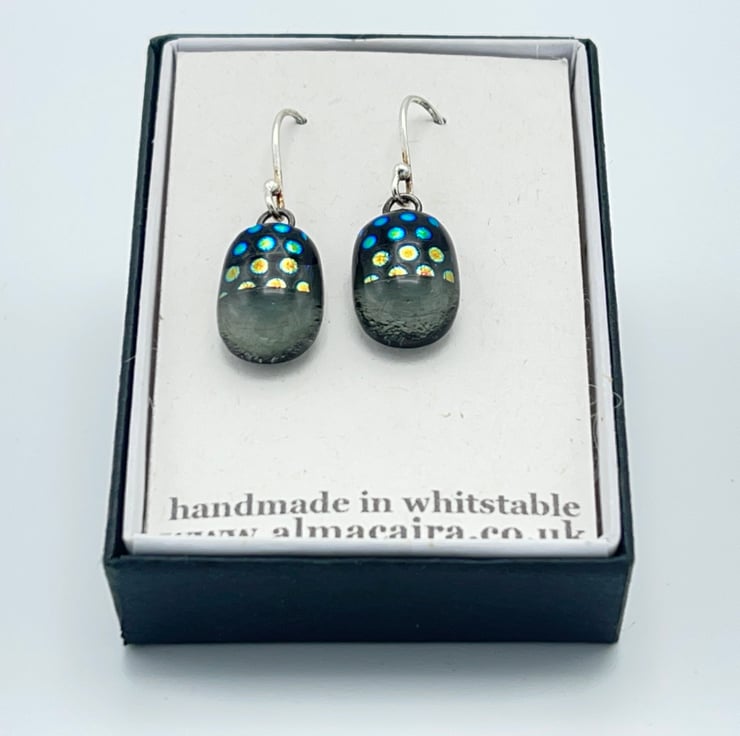 Created from layered Bullseye glass in my Whitstable workshop. Sterling silver ear wires. Made with transparent grey and dichroic glass.