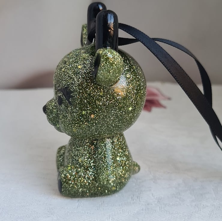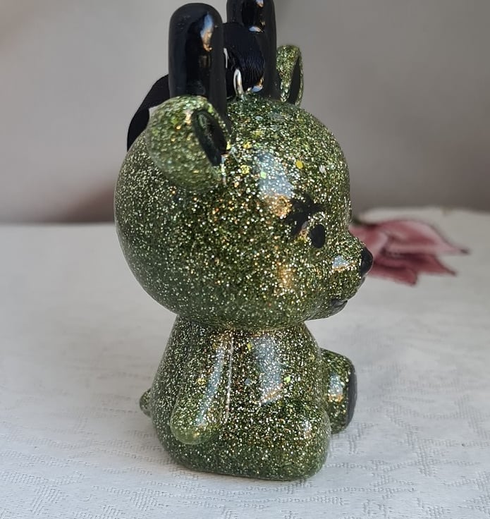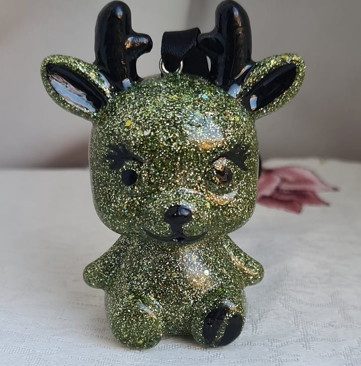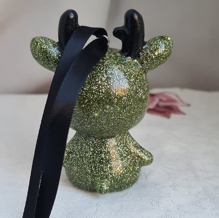 Reindeer Height is approx 7cm high, 5.5cm at widest part. Ribbon is approx 10cm long from the top of Reindeer's head to the bottom of the knot and is a Black satin. Figurine is made of Green Glitter in Resin and has painted antlers and features.