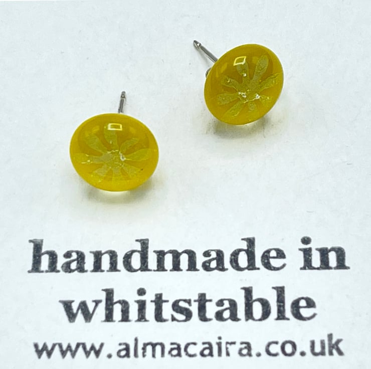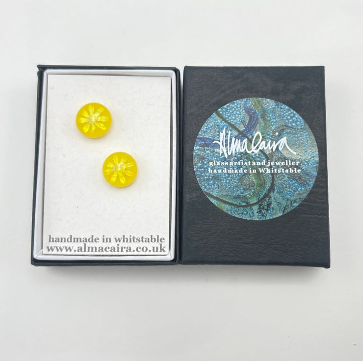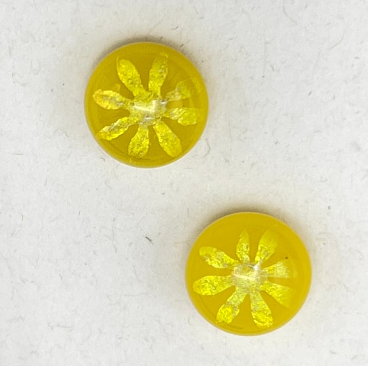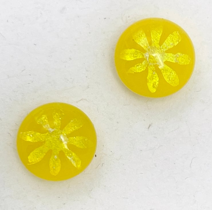 Vibrant yellow fused glass stud earrings with iridescent flowers.