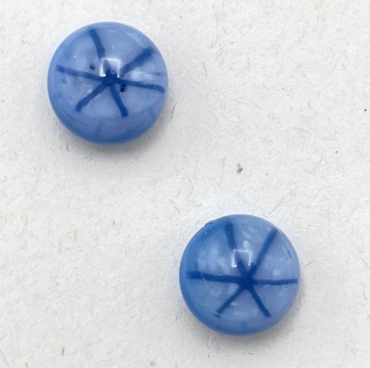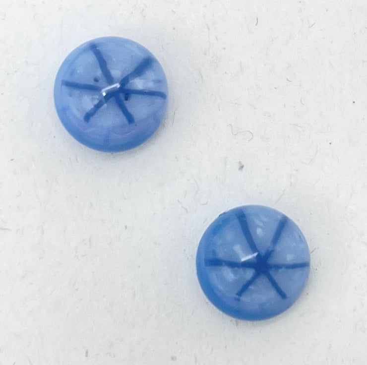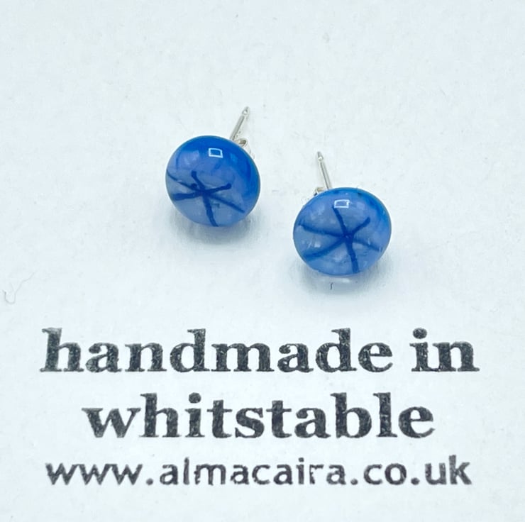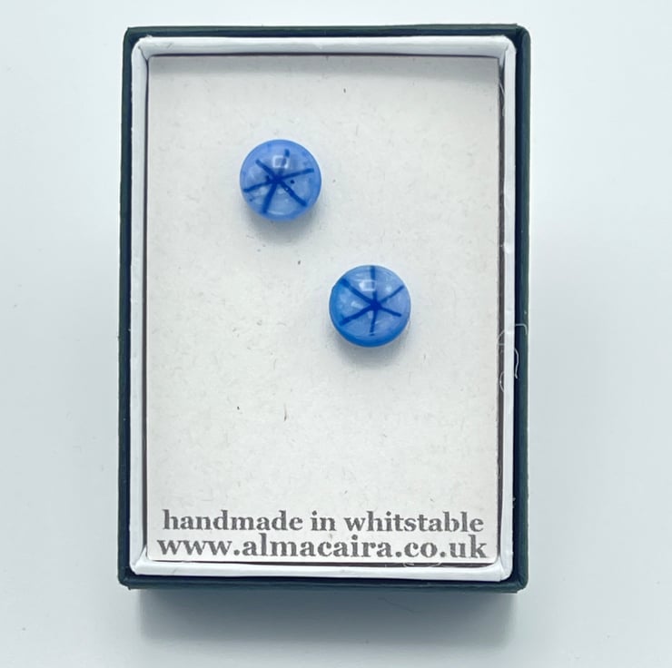 Created from layered Bullseye glass in my Whitstable workshop. Sterling silver ear wires. These pale blue earrings have a tiny starburst effect.