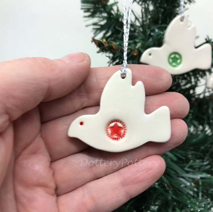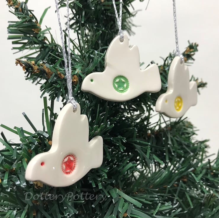 This set of three little ceramic dove decoration are made from white earthenware clay and finished with a bright star design. They have been fired in an electric pottery kiln, so are nice and strong. They measure 4.5cm x 4cm and hang from a silver string. Glazed on the front and left plain on the back.